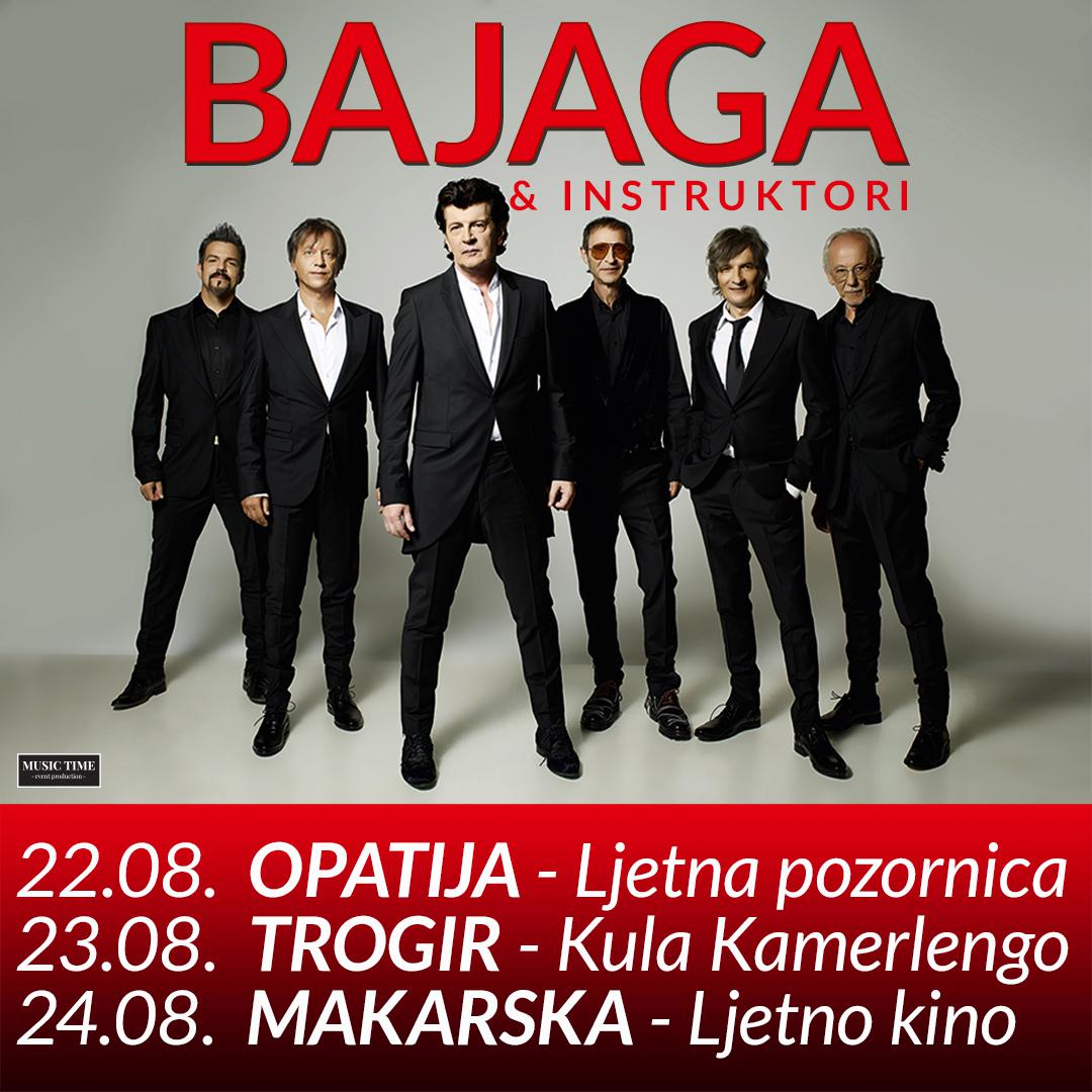 Bajaga i Instruktori nastupit će u Opatiji na Ljetnoj pozornici 22. kolovoza u 21:30 sati, u sklopu festivala “Kolovozfest”, u Trogiru u kuli Kamerlengo 23. kolovoza u 21 sat te u Makarskoj u Ljetnom kinu 24. kolovoza u 21 sat. Koncert ovih legenda dići će Vas na noge! Ulaznice za sve koncerte možete kupiti putem sustava Eventim. Ulaznice za koncert u Opatiji možete kupiti putem sustava Mojekarte, za koncert u Trogiru preko sustava Croatia Tickets te u Turističkoj zajednici grada Trogira i za koncert u Makarskoj preko sustava Croatia Tickets te u agenciji Marivaturist.