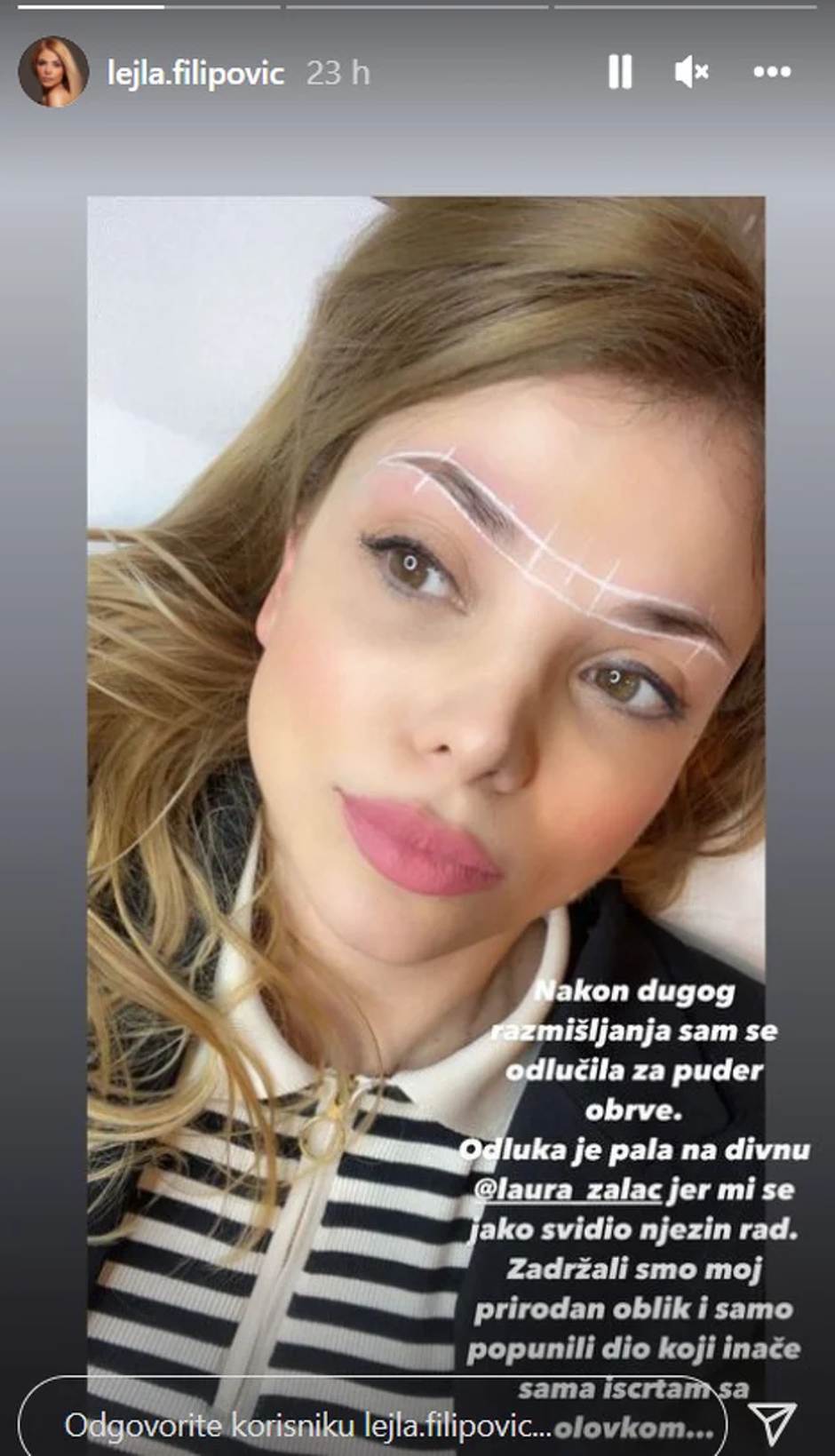 "Nakon dugog razmišljanja sam se odlučila za puder obrve. Zadržali smo moj prirodan oblik i samo popunili dio koji inače sama iscrtam olovkom", napisala je Lejla i pojasnila kako će boja za tjedan dana biti svjetlija, identična njezinoj boji kose.