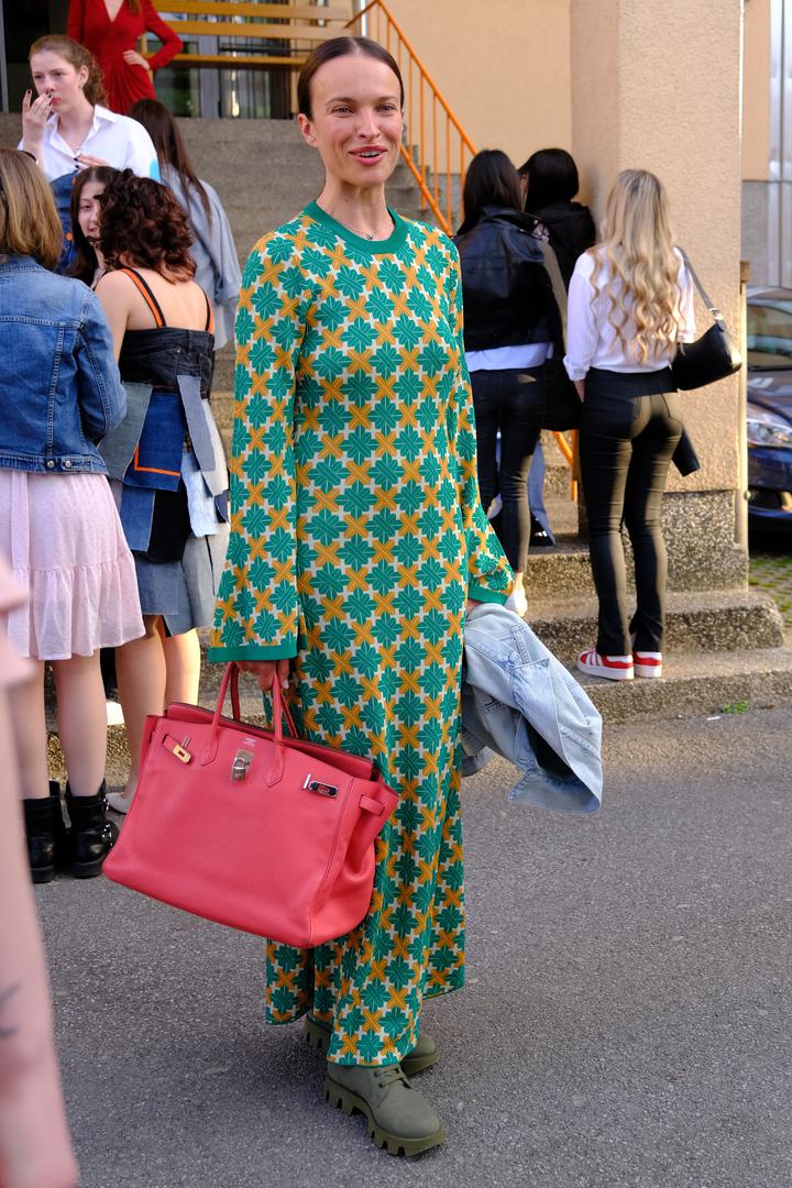 Na reviju je stigla u elegantnom zelenom izdanju- maksi haljinu s uzorkom kombinirala je s maslinastozelenim čizmama i popularnom Birkin torom brenda Hermes čija je početna cijena ovisno o modelu i veličini od 9000 dolara (65.000 kuna), a potom je u zanimljivoj haljinici s volanima prošetala modnom pistom te pokazala vitke noge i lice bez trunke šminke.