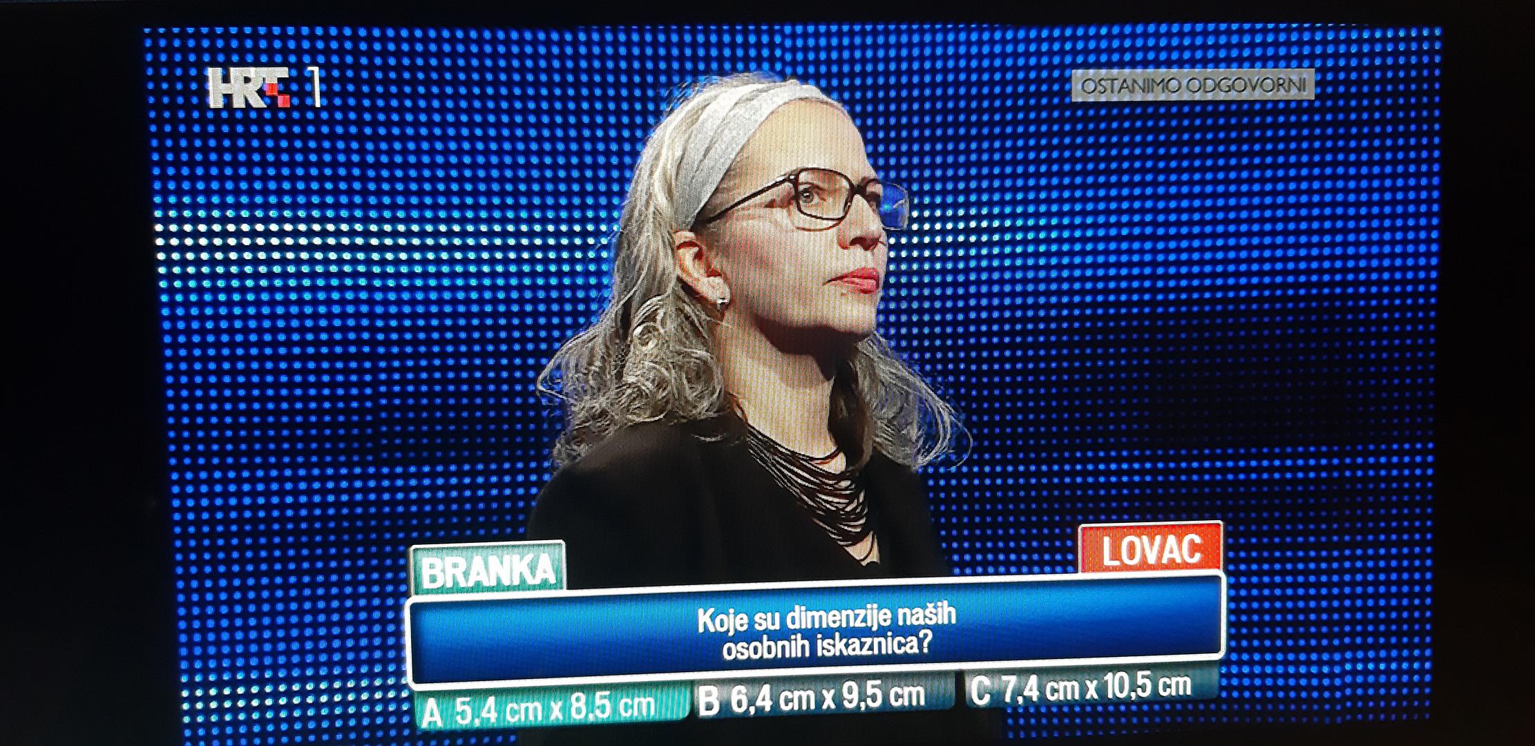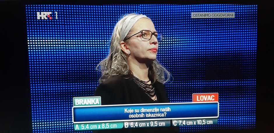 "Koje su dimenzije naših osobnih iskaznica?". Ponuđeni odgovori bili su A: 5,4 cm x 8,5 cm, B: 6,4 cm x 9,5 cm i C: 7,4 cm x 10,5 cm. Branka je točno odgovorila 5,4 cm x 8,5 cm dok je Krešo ponudio odgovor pod slovom B: 6,4 cm x 9,5 cm koji je bio pogrešan. Branka je naposljetku uspjela obraniti višu ponudu i vratiti se u završnu potjeru.