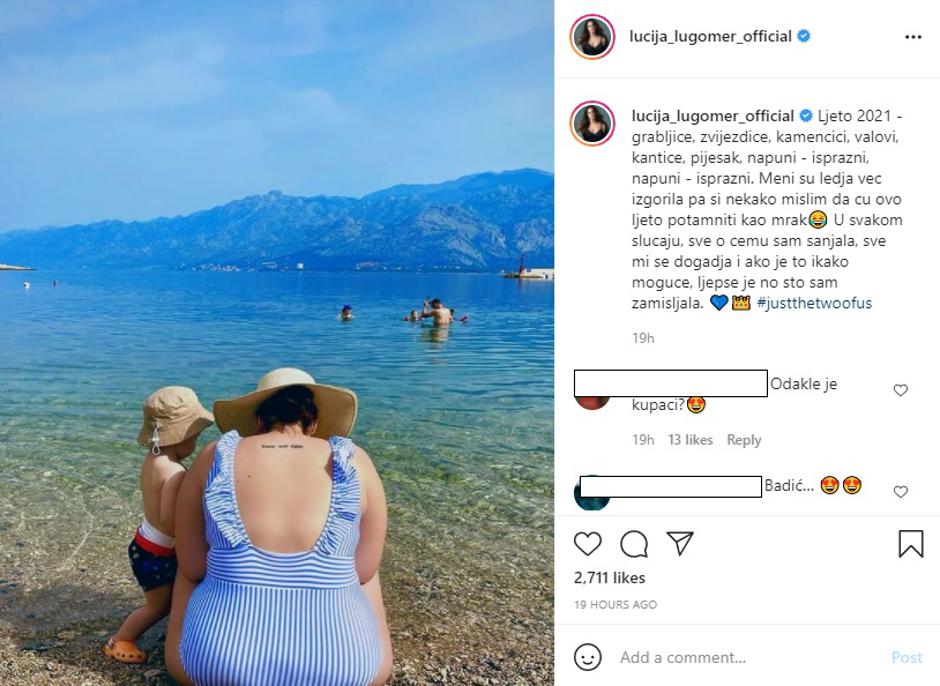 Plus size model Lucija Lugomer uživa u ljetnim radostima. Da je na odmoru svojim je pratiteljima dala do znanja fotografijom na Instagramu na kojoj pozira s leđa u kupaćem kostimu dok se pored nje u plićaku igra njezin sin Leon.