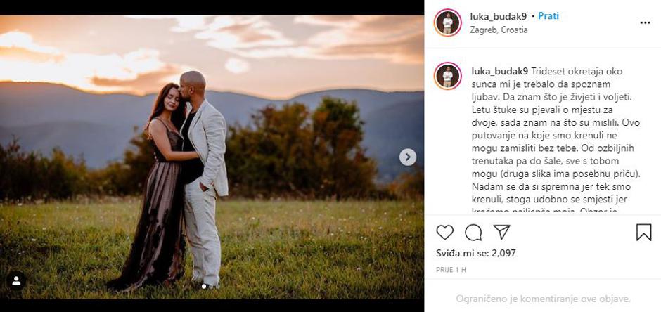 "Trideset okretaja oko sunca mi je trebalo da spoznam ljubav. Da znam što je živjeti i voljeti. Letu štuke su pjevali o mjestu za dvoje, sada znam na što su mislili. Ovo putovanje na koje smo krenuli ne mogu zamisliti bez tebe. Od ozbiljnih trenutaka pa do šale, sve s tobom mogu (druga slika ima posebnu priču). Nadam se da si spremna jer tek smo krenuli, stoga udobno se smjesti jer krećemo najljepša moja. Obzor je prekrasan, kao i ti", napisao je Luka, a ona se također oglasila na svom profilu i čestitala mu rođendan.