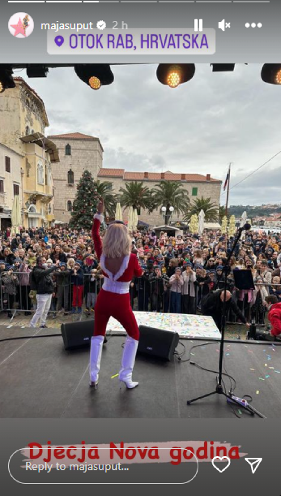 Pjevačica Maja Šuput za Novu godinu pjeva na Rabu, a svoj je nastup već započela. Naime, Maja je u podne dočekala dječju Novu godinu, a tamo je pjevala obučena u interesantnu kombinaciju. Pjevačica je na svojem Instagramu pokazala kako je za ovaj doček odabrala kombinaciju koja podsjeća na odijelo Djeda Božićnjaka.