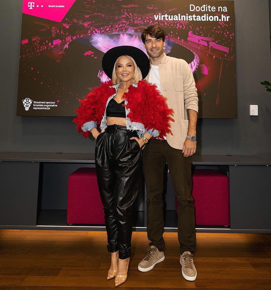 Pjevačica na fotografiji nosi štikle, crne hlače i crni topić preko kojeg je odjenula kratku traper jaknu s dodatkom crvenog perja. Bivši reprezentativac bio je u opuštenom izdanju, u tamnim hlačama i bijeloj majici, a sportski sako i tenisice podudarali su se u boji.