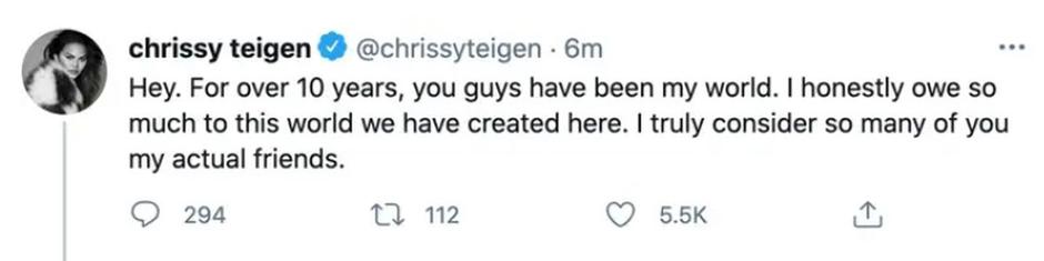 "Više od deset godina bili ste moj svijet. Iskreno, puno dugujem svijetu koji smo stvorili ovdje. Mnoge od vas smatram svojim stvarnim prijateljima", započela je Teigen niz objava prije nego što je izbrisala profil.