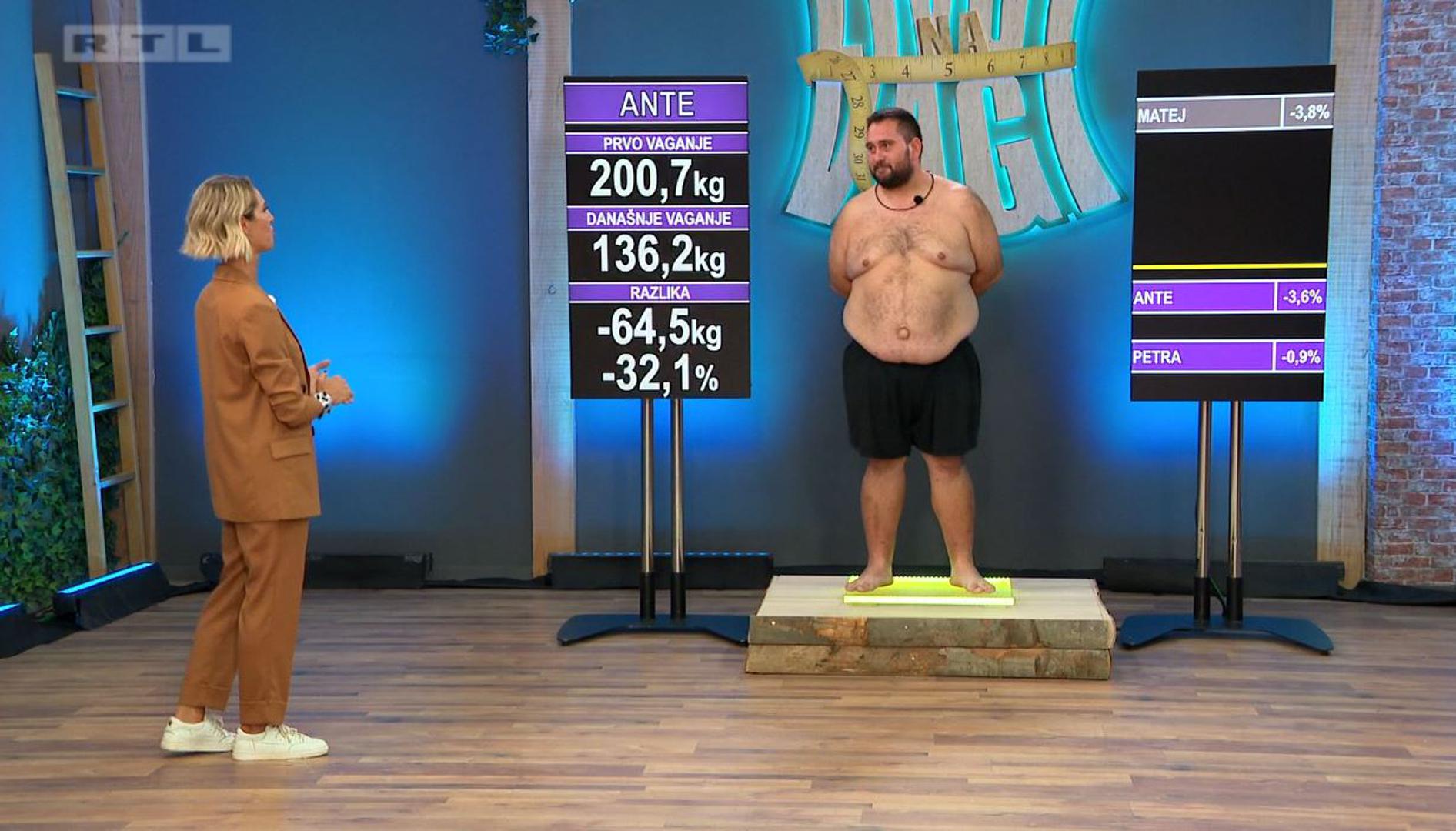 Na posljednjem vaganju imao je 141,3 kilograma, a u ovom zadnjem ciklusu skinuo je čak 5,1! Tako Ante iz showa izlazi sa 136,2 kilograma. U show je ušao sa 200,7 kilograma, a izgubio je 64,5 kilograma, odnosno 32,1% tjelesne mase!