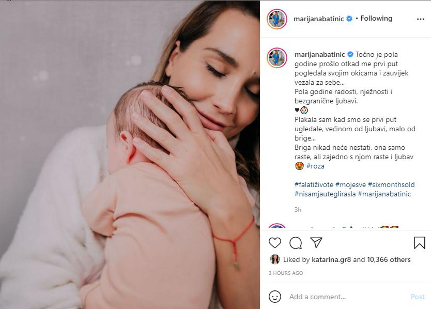 "Točno je pola godine prošlo otkad me prvi put pogledala svojim okicama i zauvijek vezala za sebe. Pola godine radosti, nježnosti i bezgranične ljubavi. Plakala sam kad smo se prvi put ugledale, većinom od ljubavi, malo od brige. Briga nikad neće nestati, ona samo raste, ali zajedno s njom raste i ljubav", stoji u objavi.