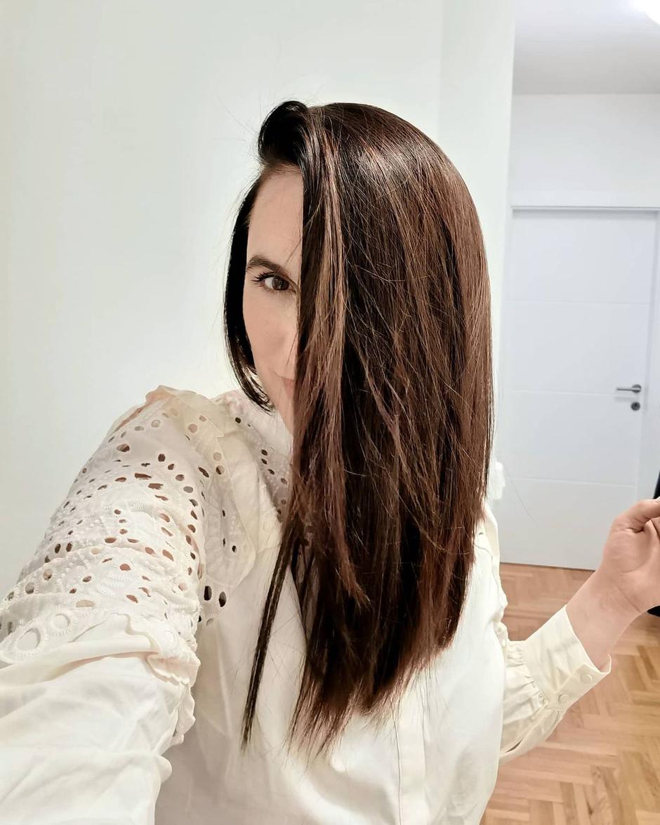 "Nakon 15 godina prirodna boja kose, Pinku svjetlija na fotkama nego uživo, Meni savršena. Uvijek eksperimentiranje, isprobavanje, a na kraju uvijek najbolje ono što nam je prirodno dano", napisala je glumica ispod fotografije s novom, svjetlijom, smeđom bojom kose. Pored nove boje pokazala je i kako je izgledala promjena boje u salonu, pod maskama.