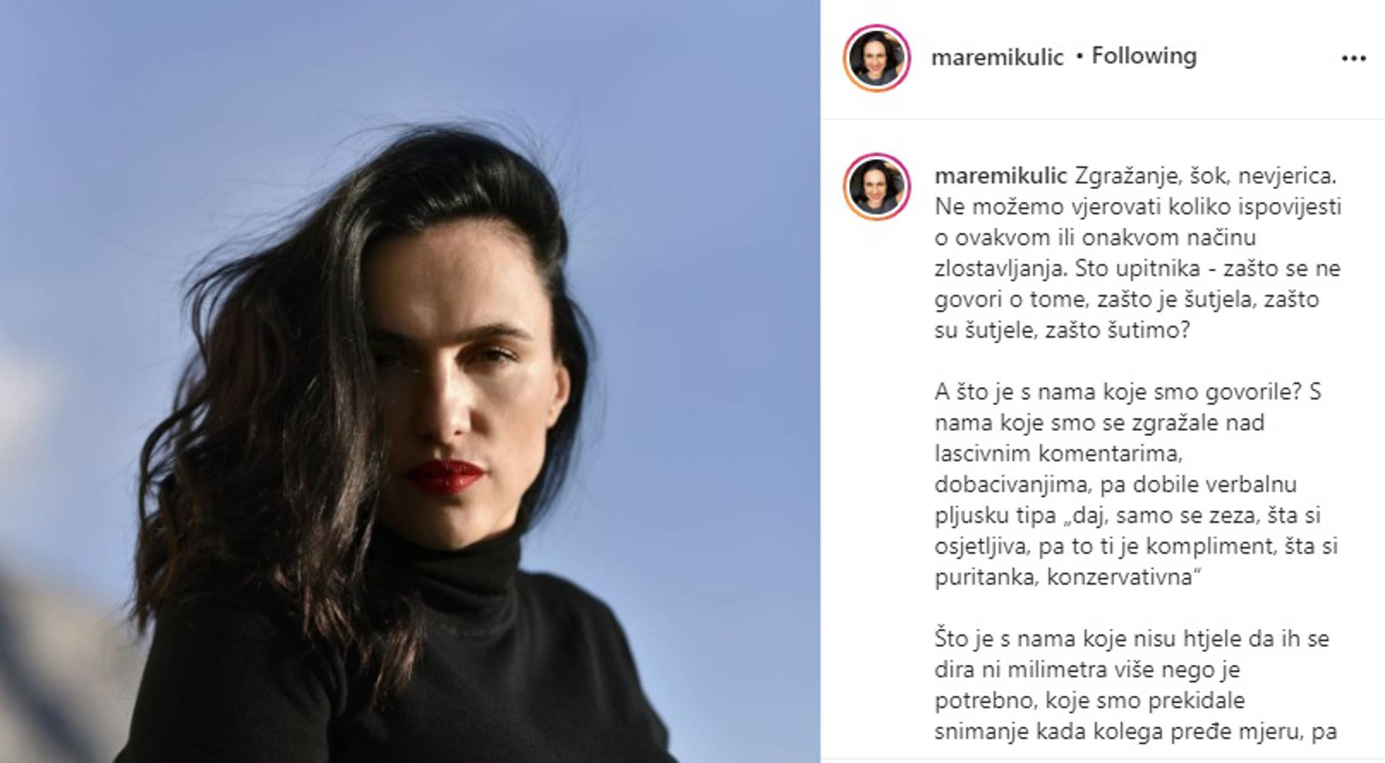 Glumica Milena Radulović svojim priznanjem kako ju je silovao filmski redatelj, producent i glumac Miroslav Mika Aleksić potakla je i druge glumice iz cijele regije da ispričaju svoje priče o seksualnom zlostavljanju na radnom mjestu i fakultetu. Naša glumica Marijana Mikulić se već jučer osvrnula na ispovijesti svojih kolegica, a napisala je i danas objavu na Instagramu u kojem se osvrnula na ovu temu i ukazala s čime se glumice često susreću na radnom mjestu.