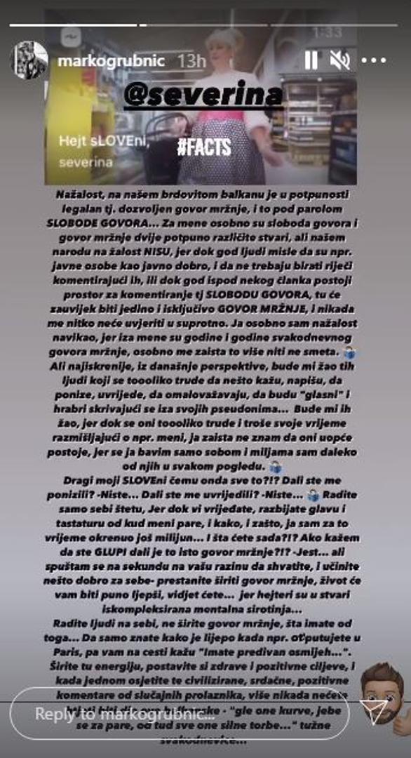 "Nažalost, na našem brdovitom Balkanu je u potpunosti legalan, tj. dozvoljen govor mržnje, i to pod parolom slobode govora... Za mene osobno su govor mržnje i sloboda govora dvije potpuno različite stvari, ali našem narodu nažalost nisu jer dok god ljudi misle da su npr. javne osobe kao javno dobro i da ne trebaju birati riječi komentirajući ih, ili dok god ispod nekog članka postoji prostor za komentiranje, tj. slobodu govora, tu će zauvijek biti jedino i isključivo govor mržnje, i nikada me nitko neće uvjeriti u suprotno. Ja osobno sam nažalost navikao, iza mene su godine i godine svakodnevnog govora mržnje, osobno me zaista to više niti ne smeta. Ali najiskrenije, iz današnje perspektive, bude mi žao tih ljudi koji se toliko trude da nešto kažu, napišu, da ponize, uvrijede, da omalovažavaju, da budu glasni i hrabri skrivajući se iza svojih pseudonima. Bude mi ih žao jer dok se oni toliko trude razmišljajući o meni, ja zaista ne znam ni da oni uopće postoje jer se bavim sobom i miljama sam daleko od njih u svakom pogledu. Dragi moji SLOVeni, čemu onda sve to? Jeste li me ponizili? Niste... Jeste li me uvrijedili? Niste... Radite samo sebi štetu. Jer dok vi vrijeđate, razbijate glave i tastaturu otkud meni pare, i kako i zašto, ja sam za to vrijeme okrenuo još milijun... I što ćete sad? Ako kažem da ste glupi, je li to isto govor mržnje? Jest... Ali spuštam se na sekundu na vašu razinu da shvatite, i učinite nešto dobro za sebe - prestanite širiti govor mržnje, život će vam biti puno ljepši, vidjet ćete... Jer hejteri su u stvari iskompleksirana mentalna sirotinja. Da samo znate kako je lijepo kad, npr., otputujete u Pariz pa vam na cesti kažu da imate prekrasan osmijeh. Širite tu energiju, postavite si zdrave i pozitivne ciljeve i kad jednom osjetite te civilizirane, srdačne, pozitivne komentare od slučajnih prolaznika više nikada nećete htjeti biti dio ove balkanske – 'gle one kurve, jebe se za pare, od tud sve one silne torbice', tužne svakodnevice", napisao je Grubnić u podužem storyju.