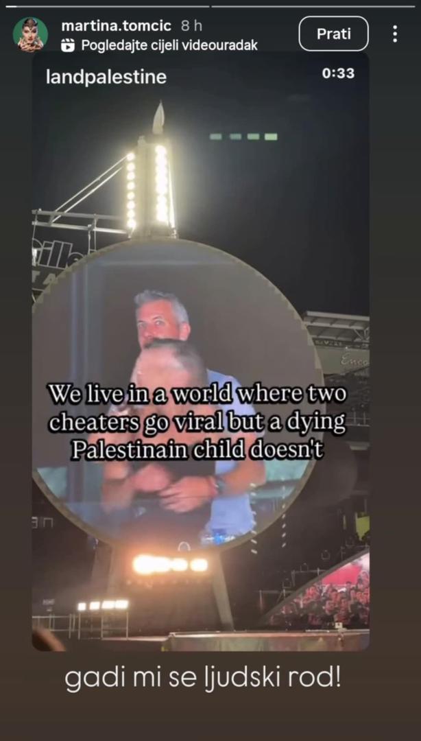Poznata operna pjevačica i članica žirija 'Supertalenta', Martina Tomčić, oštro je reagirala na aferu koja je obišla svijet. Na Instagramu je podijelila video viralnih ljubavnika s koncerta Coldplaya uz poruku koja je mnoge potaknula na razmišljanje. - Gadi mi se ljudski rod! - tim je riječima Tomčić sažela svoje zgražanje nad internetskim fenomenom koji je posljednjih tjedana zaokupio globalnu pažnju. Na svom profilu podijelila je viralnu snimku ljubavnika s koncerta, na kojoj je stajao tekst: "Živimo u svijetu u kojem dvije varalice postanu viralne, ali palestinsko dijete koje umire ne". Ovim je potezom operna diva i sutkinja popularnog showa jasno dala do znanja kako smatra da su društveni prioriteti potpuno poremećeni.