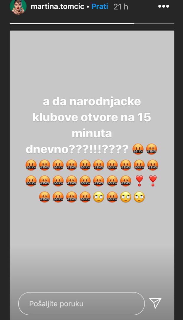Ministar Vili Beroš poručuje da je Ministarstvo zdravstva i ekspertna skupina jednoglasno zaključila da „treba posjete djeci omogućiti na 15 minuta“, u svim bolnicama, a na ovo je ubrzo reagirala operna pjevačica Martina Tomčić Moskaljov. "A da narodnjačke klubove otvore na 15 minuta dnevno???!!!" pita se Martina uz nekoliko ljutitih emotikona. Njezino razmišljanje dijeli i Doris Pinčić Rogoznica, Marijana Mikulić i druge mame koje su pozvale na potpisivanje peticije.