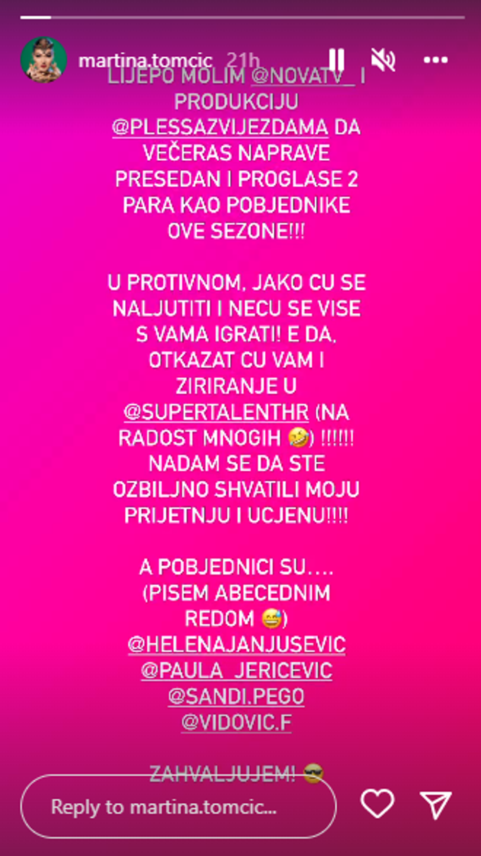 - Lijepo molim Novu TV i produkciju Plesa sa zvijezdama da večeras naprave presedan i proglase dva para kao pobjednike ove sezone. U protivnom, jako ću se naljutiti i neću se više igrati s vama. E da, i otkazat ću vam žiriranje u Supertalentu (na radost mnogih). Nadam se da ste ozbiljno shvatili moju prijetnju i ucjenu. A pobjednici su (pišem abecednim redom) Helena Janjušević, Paula Jeričević, Sandi Pego i Filip Vidović - "ucijenila" je Martina produkciju.