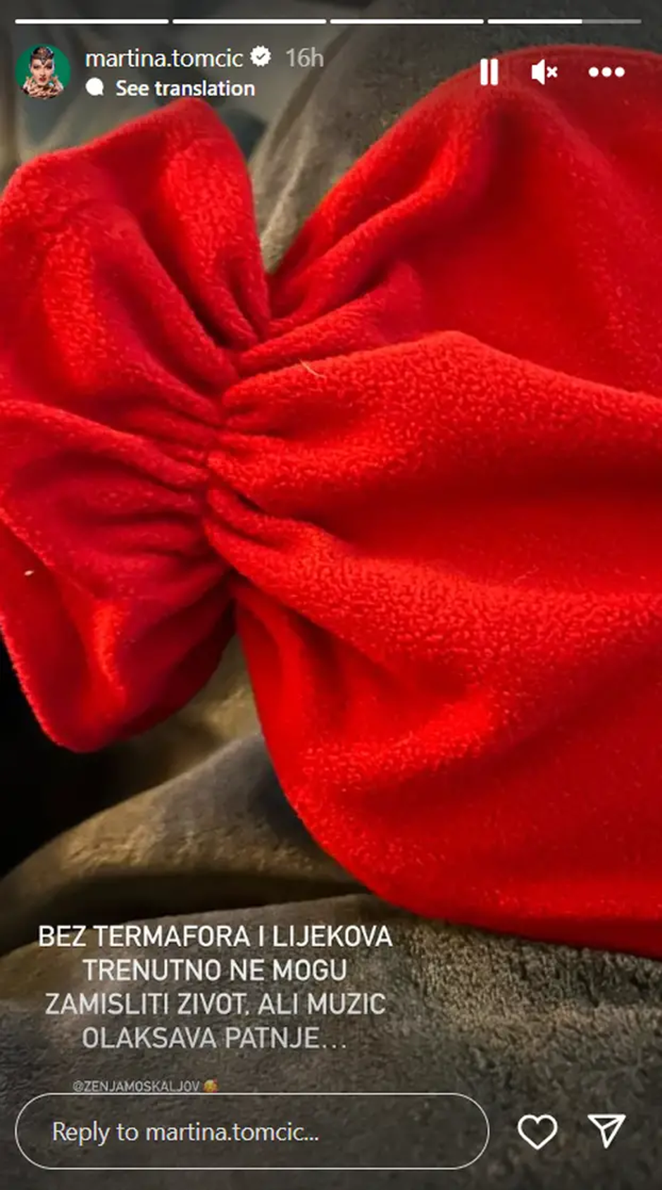 - Bez termofora i lijekova trenutno ne mogu zamisliti život. Ali mužić olakšava patnje - dodala je pa označila supruga Ženju.