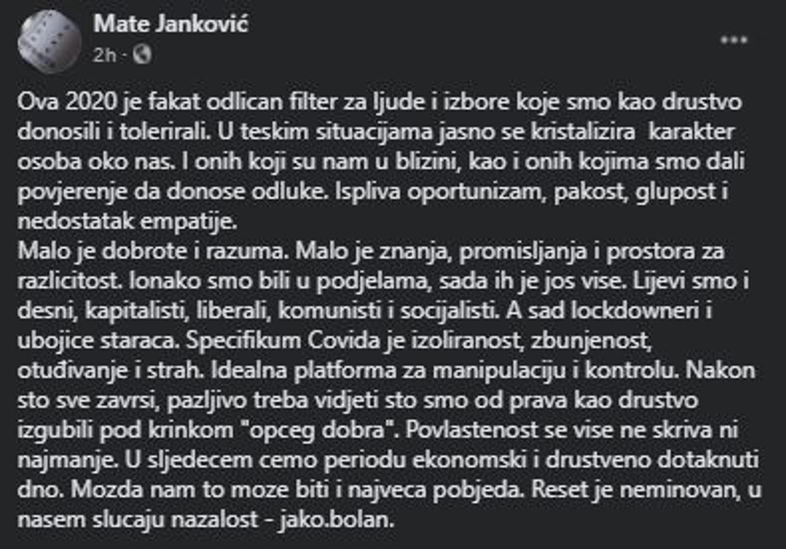 "Ova 2020 je fakat odličan filter za ljude i izbore koje smo kao društvo donosili i tolerirali. U teškim situacijama jasno se kristalizira karakter osoba oko nas. I onih koji su nam u blizini, kao i onih kojima smo dali povjerenje da donose odluke. Ispliva oportunizam, pakost, glupost i nedostatak empatije", započeo je Mate svoju objavu i nastavio: