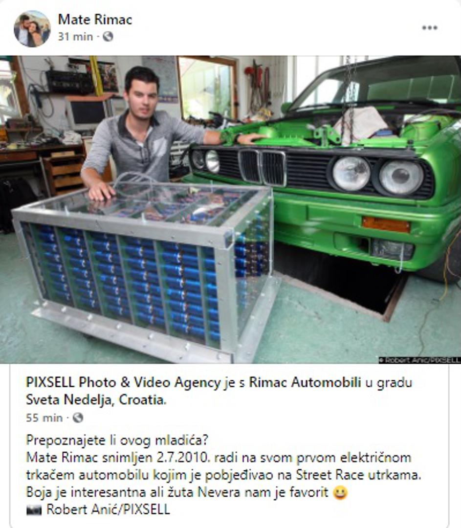 Mate Rimac (33) proteklih je dana jedan od najtraženijih Hrvata u svijetu, nakon što je njegova tvrtka Rimac automobili kupila Bugatti. Mate se često voli sjetiti svojih početaka, pa je tako na Facebooku podijelio fotografiju koju je prije 11 godina snimio Pixsellov fotoreporter Robert Anić.