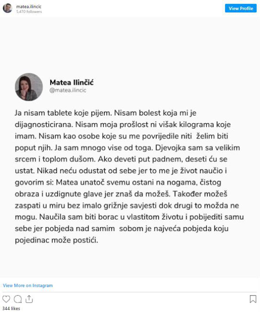 "Ja nisam tablete koje pijem. Nisam bolest koja mi je dijagnosticirana. Nisam moja prošlost ni višak kilograma koje imam. Nisam kao osobe koje su me povrijedile niti želim biti poput njih. Ja sam mnogo više od toga. Djevojka sam s velikim srcem i toplom dušom. Ako deveti put padnem, desti ću se ustati. Nikad neću odustati od sebe, jer me je život naučio i govorim si: Matea unatoč svemu ostani na nogama, čistog obraza i uzdignute glave jer znaš da možeš. Također možeš zaspati u miru bez imalo grižnje savjesti dok drugi to možda ne mogu. Naučila sam biti borac u vlastitom životu i pobijediti samu sebe jer pobjeda nad samim sobom je najveća pobjeda koji pojedinac može postići" stoji u statusu koji je Matea objavila na Instagramu.