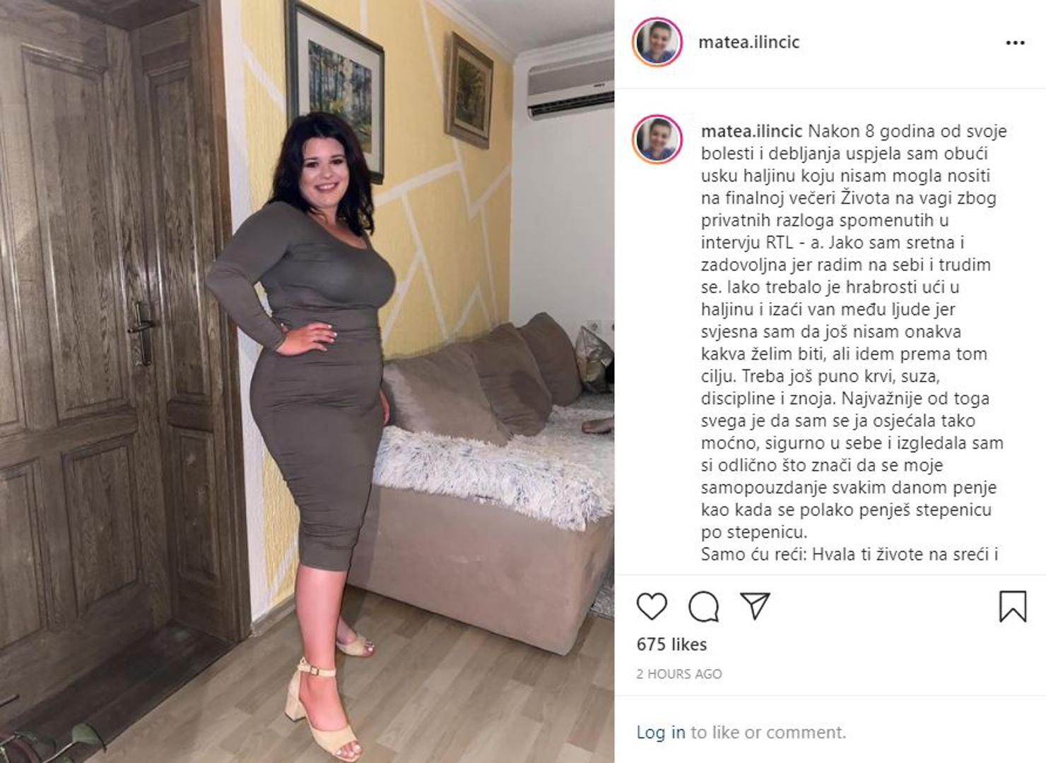 "Nakon 8 godina od svoje bolesti i debljanja uspjela sam obući usku haljinu koju nisam mogla nositi na finalnoj večeri Života na vagi zbog privatnih razloga. Jako sam sretna i zadovoljna jer radim na sebi i trudim se. Iako trebalo je hrabrosti ući u haljinu i izaći van među ljude jer svjesna sam da još nisam onakva kakva želim biti, ali idem prema tom cilju. Treba još puno krvi, suza, discipline i znoja. Najvažnije od toga svega je da sam se ja osjećala tako moćno, sigurno u sebe i izgledala sam si odlično što znači da se moje samopouzdanje svakim danom penje kao kada se polako penješ stepenicu po stepenicu. Samo ću reći: Hvala ti živote na sreći i zadovoljstvu koje osjećam! Srce mi se smije" napisala je Ilinčić.