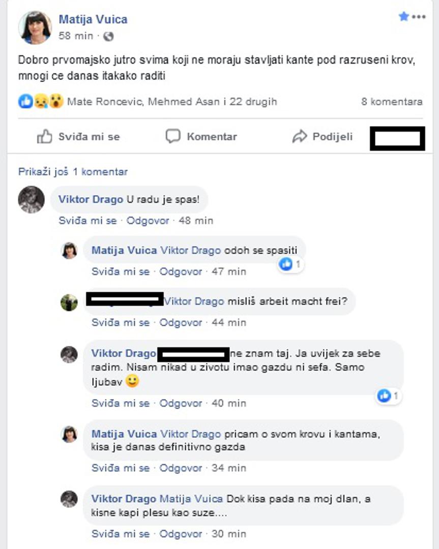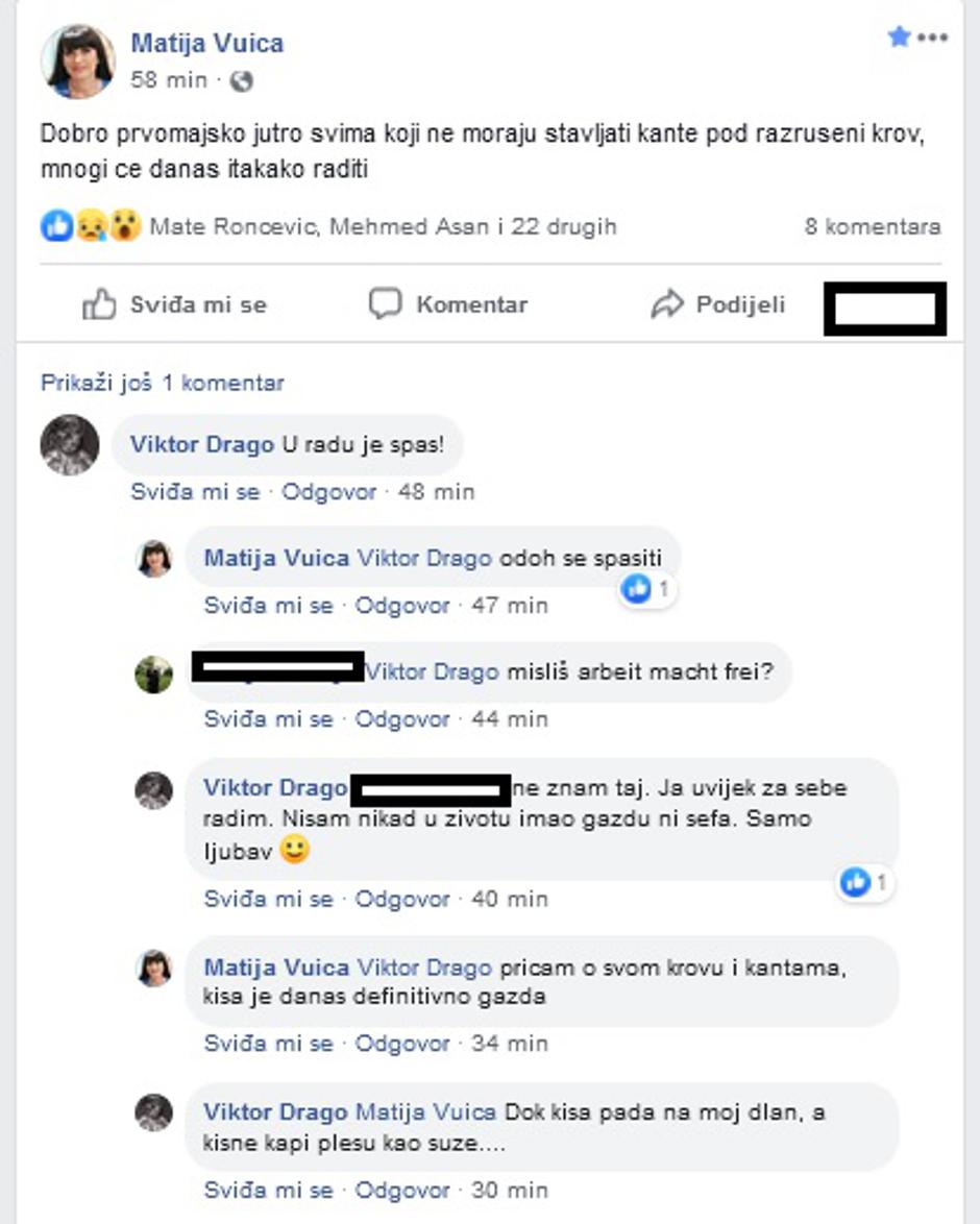 - Dobro prvomajsko jutro svima koji ne moraju stavljati kante pod razrušeni krov, mnogi će danas itekako raditi - napisala je Matija na svom Facebooku, a podršku su joj u komentarima dali i brojni prijatelji.