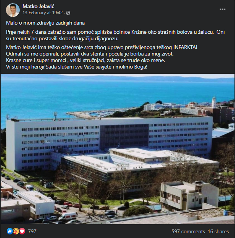 "Malo o mom zdravlju zadnjih dana. Prije nekih 7 dana zatražio sam pomoć splitske bolnice Križine oko strašnih bolova u želucu. Oni su trenutačno postavili skroz drugačiju dijagnozu: Matko Jelavić ima teško oštećenje srca zbog upravo preživljenoga teškog infarkta! Odmah su me operirali, postavili dva stenta i počela je borba za moj život. Krasne cure i super momci, veliki stručnjaci, zaista se trude oko mene. Vi ste moji heroji! Sada slušam sve Vaše savjete i molimo Boga!" napisao je na Facebooku pjevač kojem su fanovi poželjeli brzo ozdravljenje.