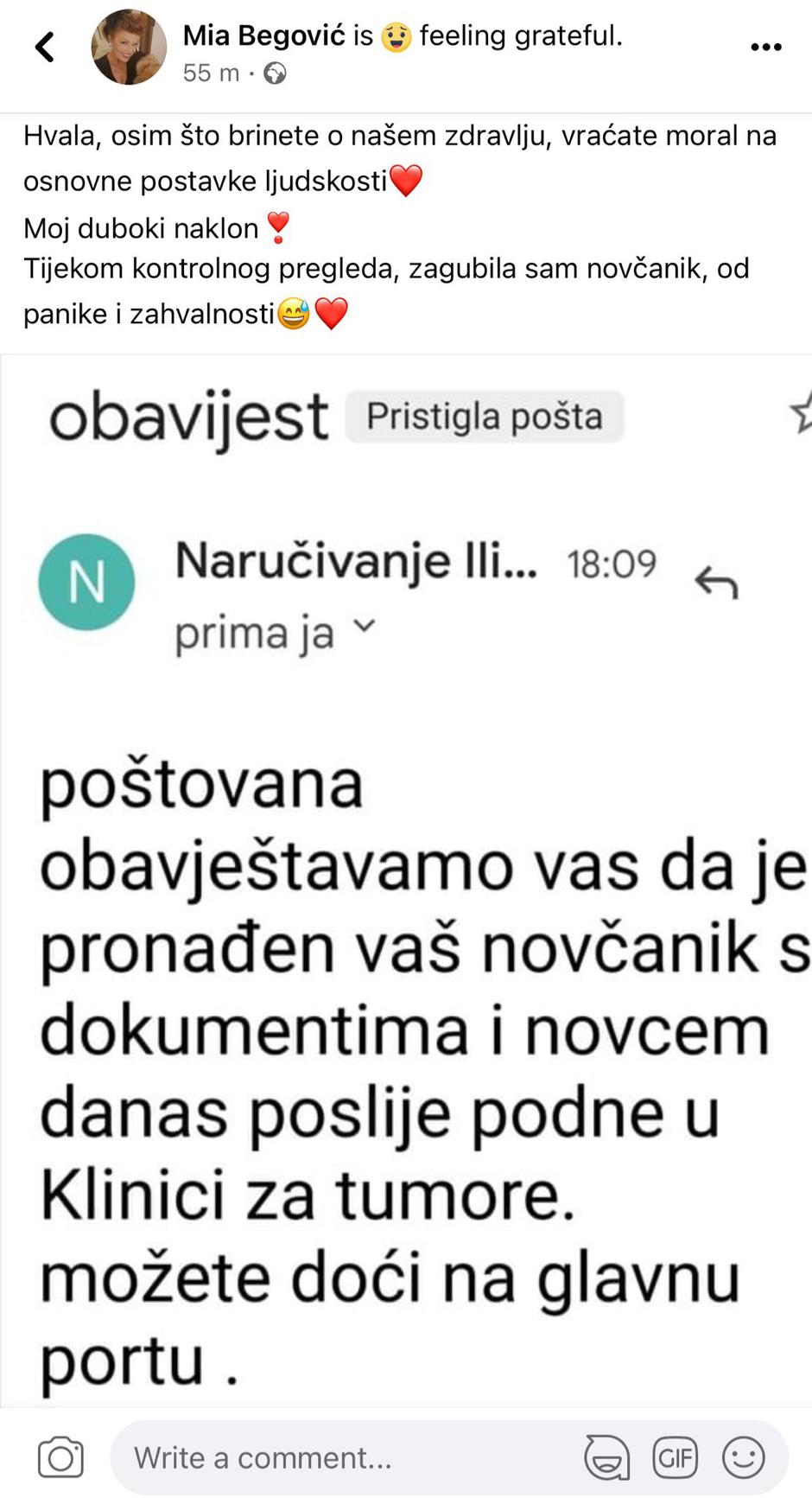 -Hvala, osim što brinete o našem zdravlju, vraćate moral na osnovne podatke ljudskosti. Moj duboki naklon. Tijekom kontrolnog pregleda, zagubila sam novčanik, od panike i zahvalnosti- napisala je Mia uz screenshot maila koji je dobila od bolnice u kojem piše: 'Poštovana, obavještavamo vas da je vas novčanik s dokumentima i novcem danas poslije podne u Klinici za tumore. Možete doći na glavnu portu'.