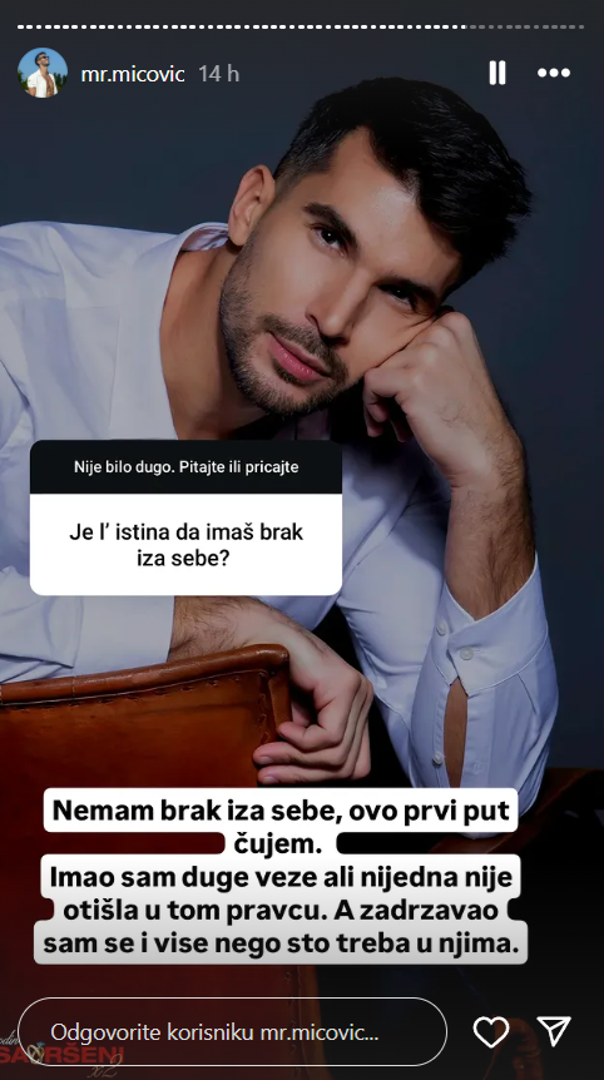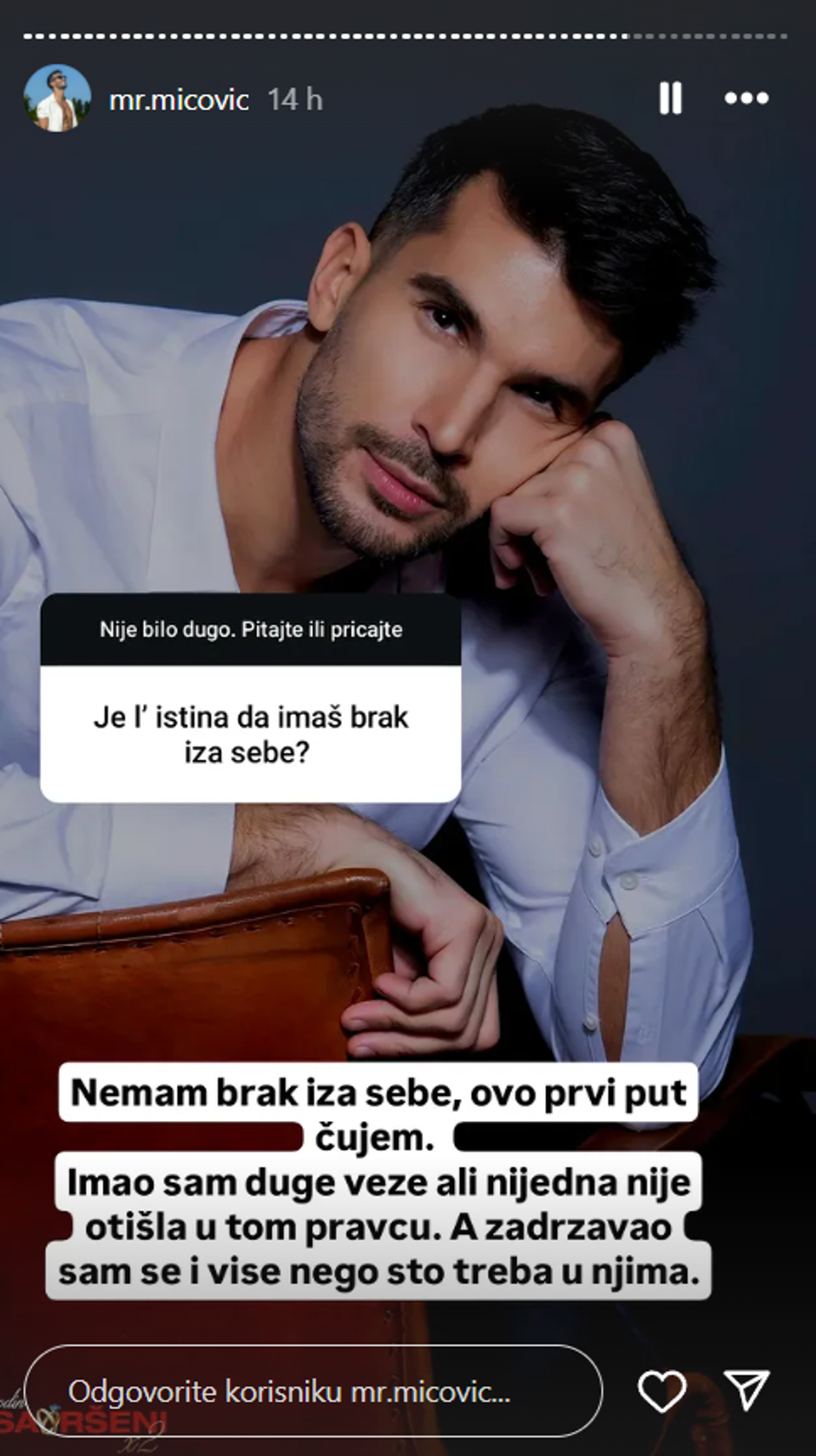 “Nemam brak iza sebe, ovo prvi put čujem. Imao sam duge veze, ali nijedna nije otišla u tom pravcu. A zadržavao sam se i više nego što treba u njima”, odgovorio je srpski maneken.