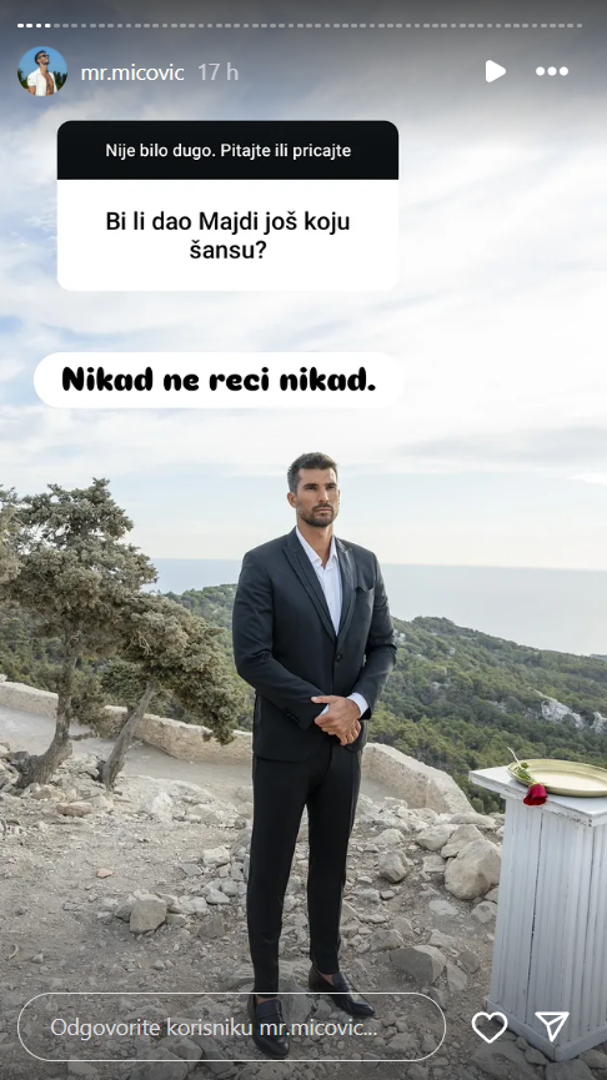 - Zato što sam, nakon svega, ipak 'tagirao' i 'lajkao' fotke, a druga strana ništa. I onda sam se iznervirao i učinio to. Ali to je sada manje bitno - odgovorio je. Dodao je i kako je svrha cijelog showa bila da pronađe ljubav, ali da se 'prava priča' treba dogoditi i nakon showa, kada se svi vrate u realnost.  Pratitelji su ga pitali i zašto ponovno ne pokuša javiti se Maidi. 'Nemaš što izgubiti', napisali su mu.