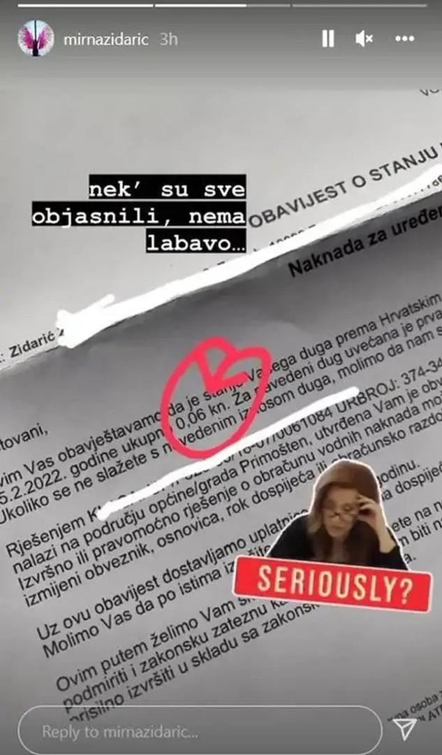 Novinarka sportske redakcije HRT-a Mirna Zidarić na Instagramu je s pratiteljima podijelila račun s iznosom dugovanja za svoju vikendicu u Primoštenu na kojem je vidljivo da je ostala dužna šest lipa.
