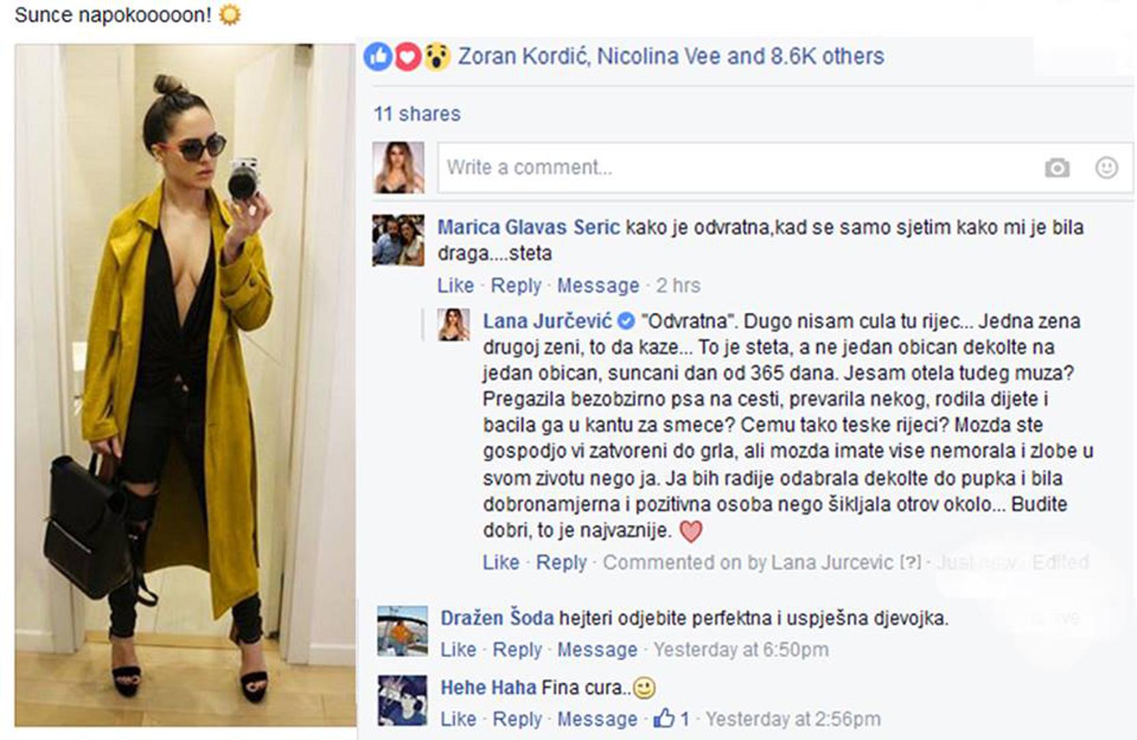 Pjevačica Lana Jurčević (31) plijeni pažnju nedavnom reakcijom na uvredljiv komentar jednog od pratitelja njezine karijere na Facebooku.