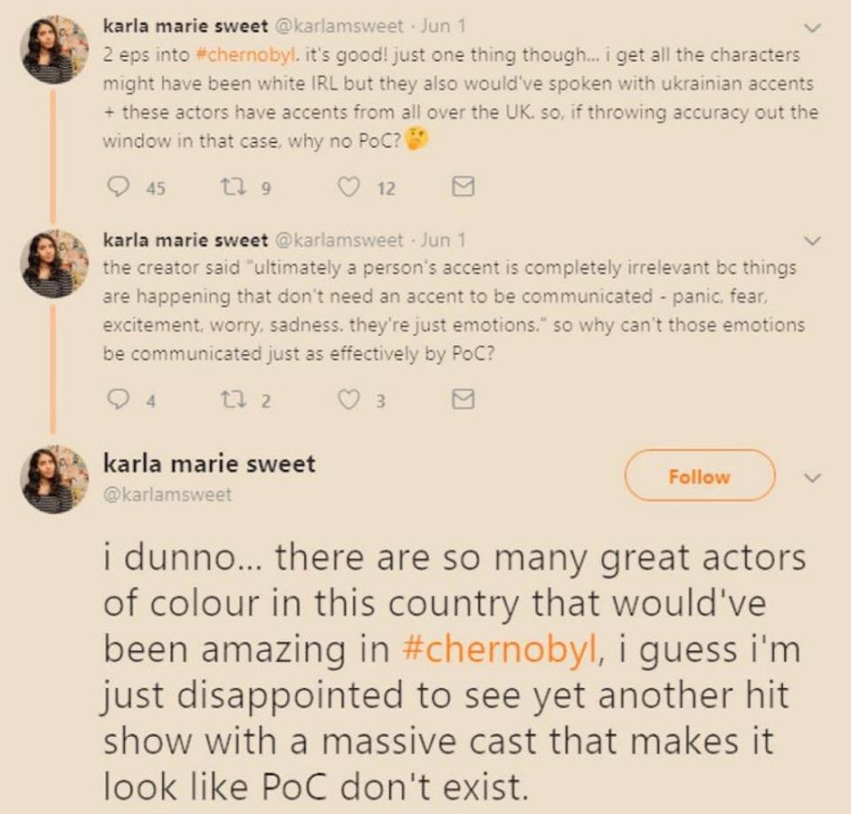 - Shvaćam da su u stvarnom životu likovi bili bijelci, no onda bi glumci trebali pričati ukrajinskim akcentom, a ja ovdje čujem britanske naglaske. Dakle, ako ih nije briga za pravi jezik, zašto onda nema tamnoputih glumaca - pitala se Sweet.