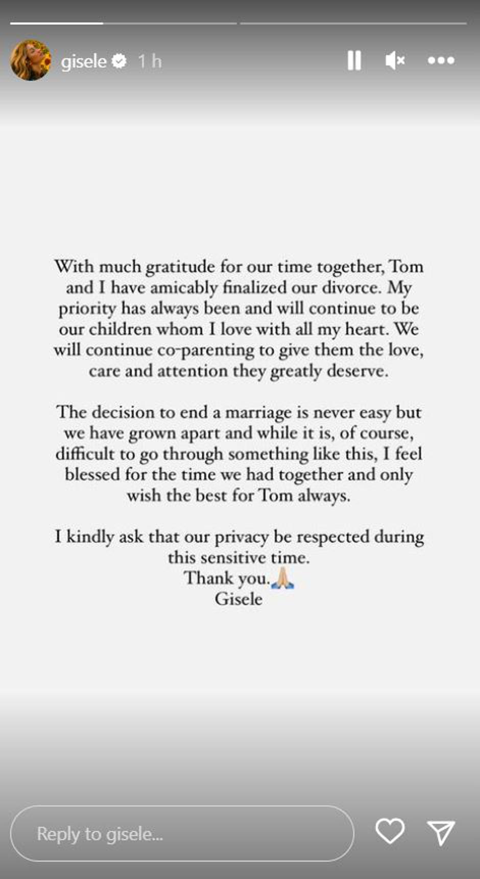 "S mnogo zahvalnošću za provedeno zajedničko vrijeme, Tom i ja smo prijateljski finalizirali naš razvod. Moj prioritet je oduvijek bio i uvijek će biti, naša djeca koju volim svim srcem. Nastavit ćemo zajedno kao roditelji davati im ljubav, pažnju i brigu kakvu zaslužuju", napisala je i dodala: "Odluka za prekid braka nikada nije lagana, ali smo se razišli i iako je teško prolaziti kroz ovo, osjećam se blagoslovljeno za zajedničko vrijeme i želim mu samo najbolje". Također, zamolila je za privatnost.