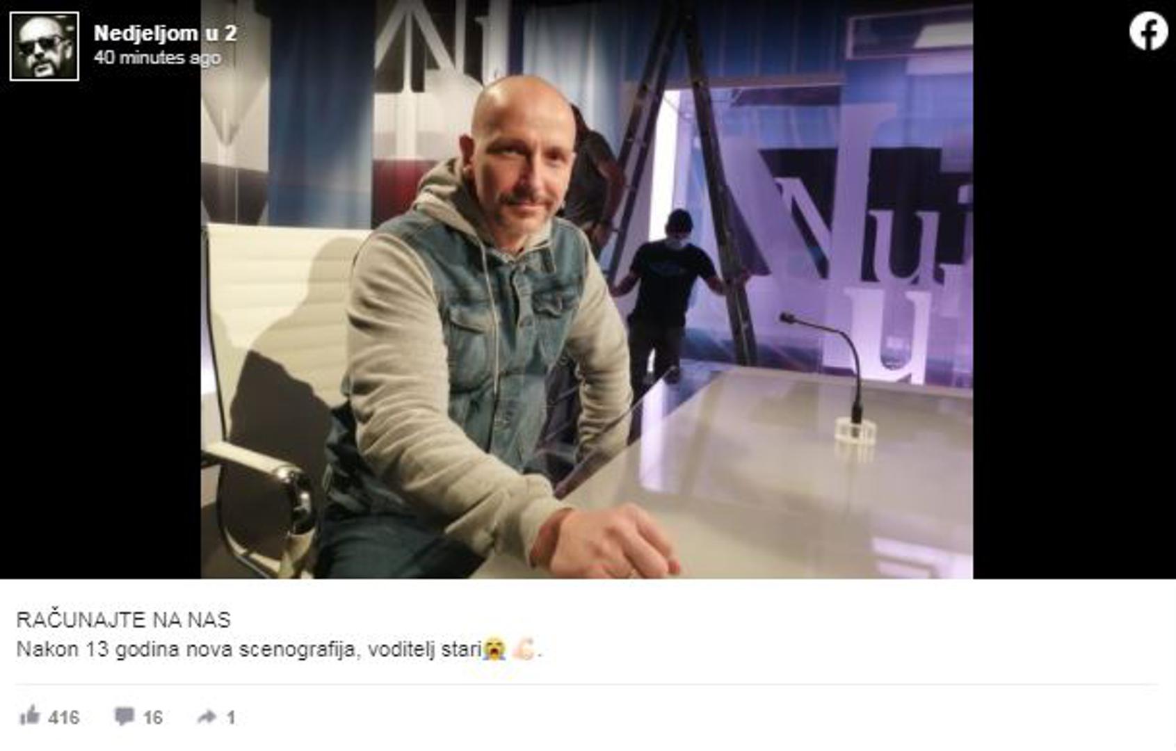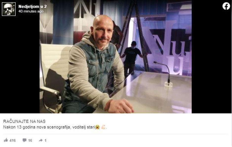 Urednik i voditelj emisije "Nedjeljom u 2" Aleksandar Stanković svoje gledatelje obavijestio je da je njegova emisija dobila novu scenografiju. Ova promjena veliko je osvježenje nakon čak 13 godina, a to misle i pratitelji na društvenim mrežama, od kojih je njih čak 400 lajkalo fotku u prvih nekoliko minuta od objavljivanja.