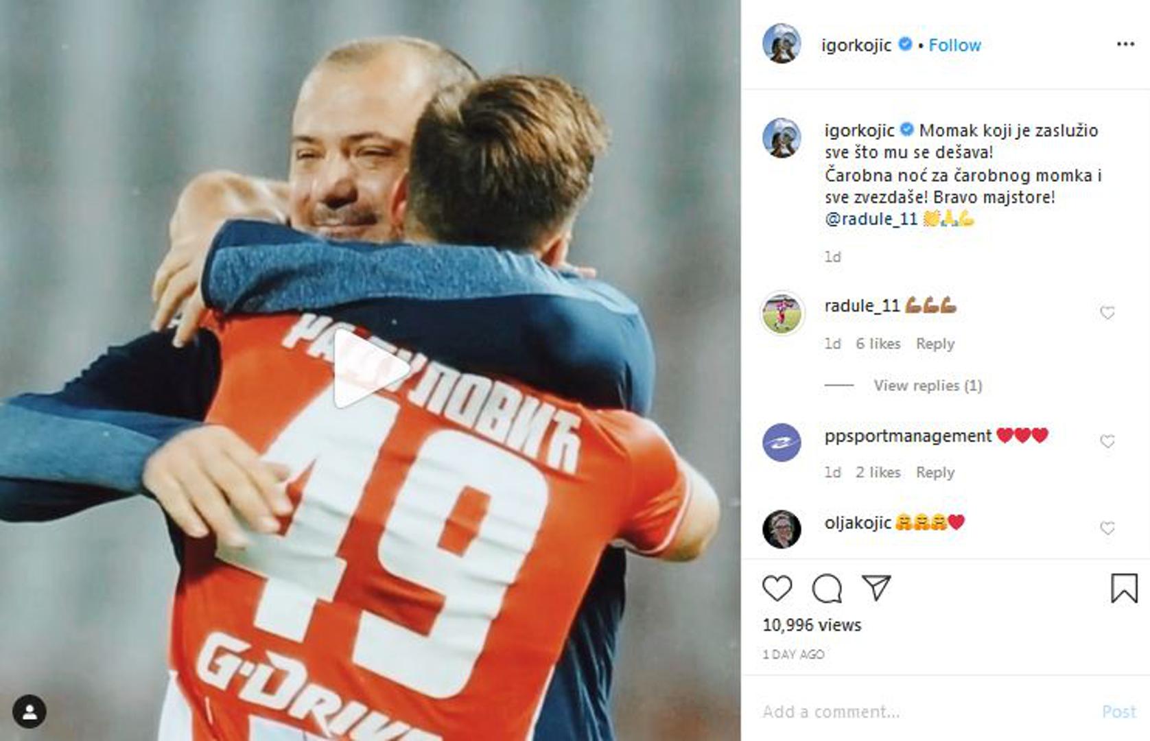 "Momak koji je zaslužio sve što mu se događa! Čarobna noć za čarobnog momka i sve zvezdaše! Bravo majstore!" poručio je Kojić uz video Radulovićeva prvog pogotka za seniorsku momčad bivšeg prvaka Europe, a na lijepim riječima ubrzo mu je zahvalio i sam Radulović.