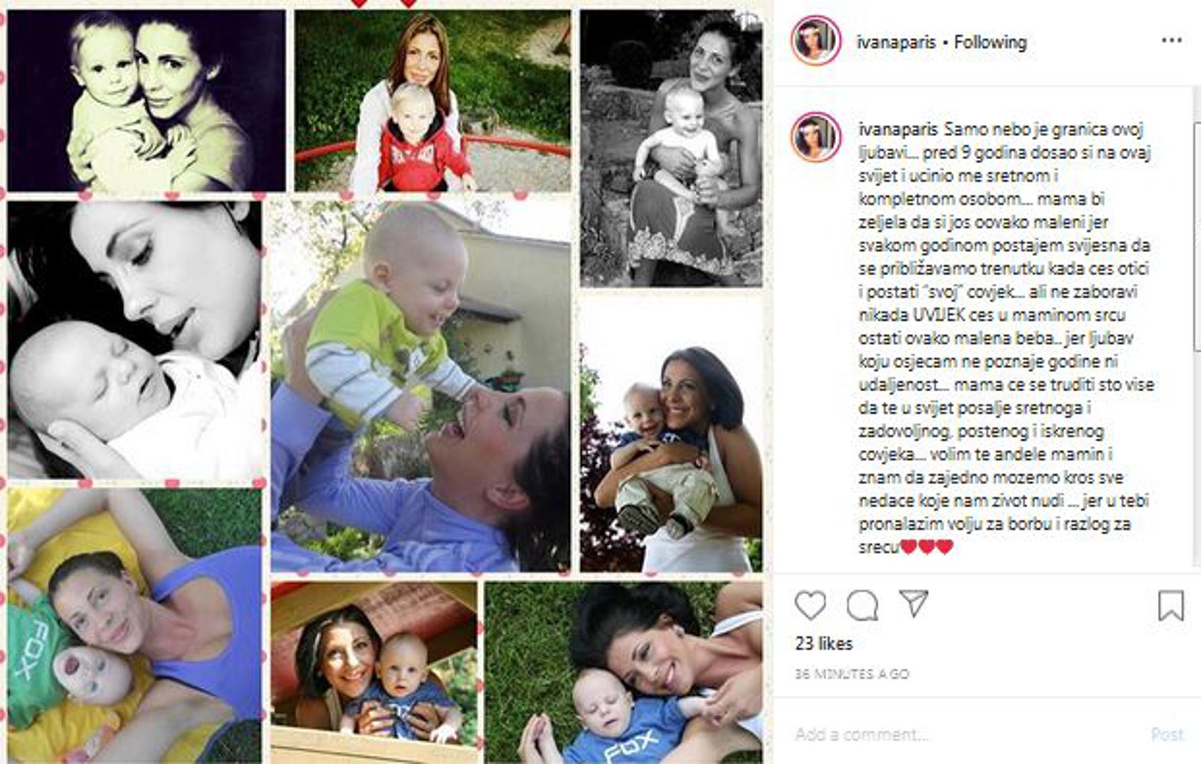 "Samo nebo je granica ovoj ljubavi... pred 9 godina došao si na ovaj svijet i učinio me sretnom i kompletnom osobom... mama bi željela da si još ovako maleni jer svakom godinom postajem svjesna da se približavamo trenutku kada ćeš otići i postati “svoj” čovjek... ali ne zaboravi nikada UVIJEK ćeš u maminom srcu ostati ovako malena beba.. jer ljubav koju osjećam ne poznaje godine ni udaljenost... mama će se truditi što više da te u svijet pošalje sretnoga i zadovoljnog, poštenog i iskrenog čovjeka... volim te anđele mamin i znam da zajedno možemo kroz sve nedaće koje nam život nudi ... jer u tebi pronalazim volju za borbu i razlog za sreću", napisala je Ivana uz kolaž fotografija sa sinom.