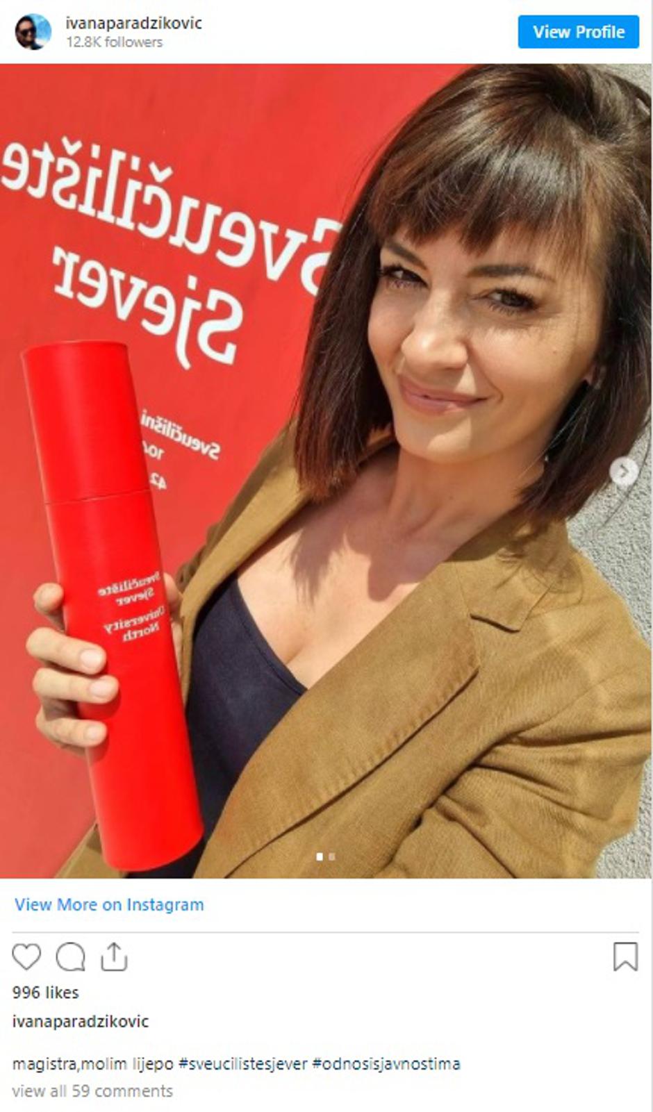 Ivana Paradžiković, bivša urednica i voditeljica emisije "Provjereno" Nove Tv pohvalila se novim profesionalnim uspjehom. Naime, Ivana je diplomirala Odnose s javnošću na Sveučilištu Sjever u Koprivnici.