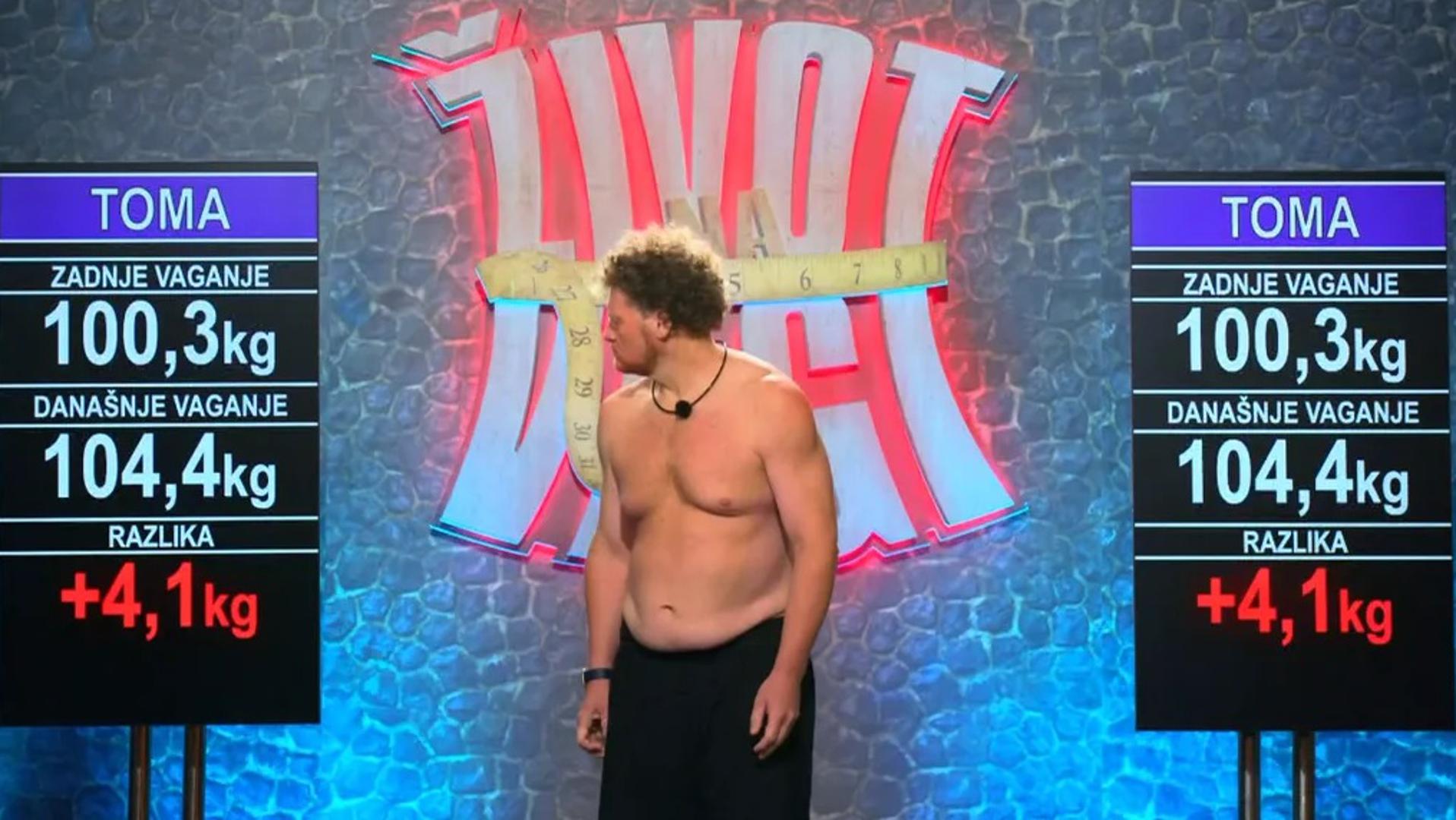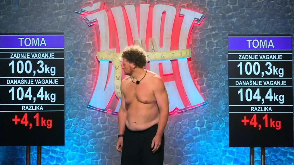 U sinoćnjoj emisiji 'Života na vagi' show je napustio jedan od favorita za pobjedu, Toma Kukoč (41) i to nakon šokantnog vaganja koje je u nevjerici ostavilo kandidate, trenere, voditeljicu, ali i gledatelje. Naime, Toma se u posljednjem ciklusu udebljao 4,1 kilogram što ga je koštalo izlaska iz showa. Ovakav scenarij još se nije dogodio u 'Životu na vagi'.