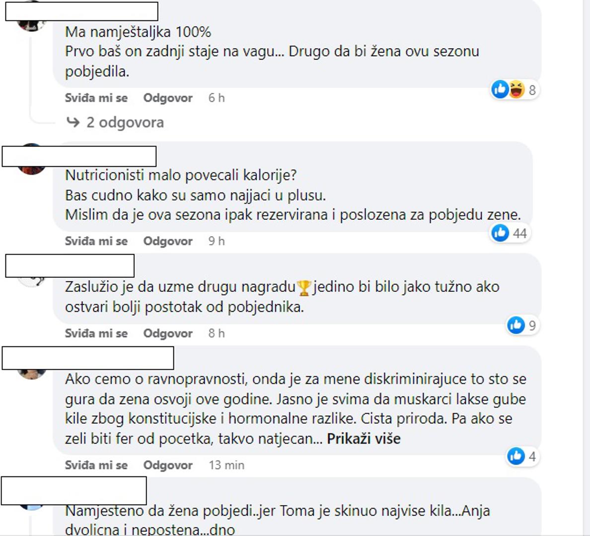 "Ako ćemo o ravnopravnosti, onda je za mene diskriminirajuće to što se gura da žena osvoji ove godine. Jasno je svima da muškarci lakše gube kile zbog konstitucijske i hormonalne razlike. Čista priroda. Pa ako se želi biti fer od početka, takvo natjecanje se baš kao i svako sportsko treba odijeliti. Ženski tim i muški tim i dva pobjednika", zaključila je jedna od nezadovoljnih gledateljica.