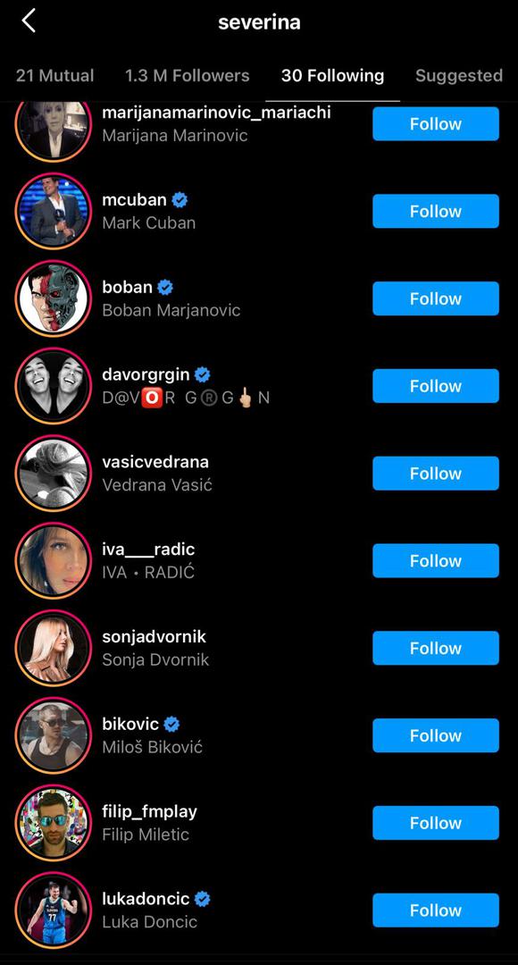 Pjevačica Severina (49) i njezin suprug Igor Kojić (34) prije nešto više od mjesec dana otpratili su se na Instagramu, a pjevačica koju prati preko milijun ljudi nije pratila nijedan profil, no to se promijenilo danas kada je zapratila je 30 profila među kojima su košarkaši Luka Dončić i Boban Marijanović s kojima se pjevačica sinoć družila na zabavi u Sloveniji.