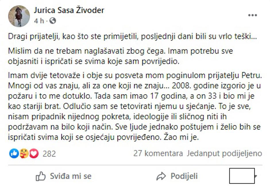 - Imam potrebu sve objasniti i ispričati se svima koje sam povrijedio.Imam dvije tetovaže i obje su posveta mom poginulom prijatelju Petru. Mnogi od vas znaju, ali za one koji ne znaju… 2008. godine izgorio je u požaru i to me dotuklo. Tada sam imao 17 godina, a on 33 i bio mi je kao stariji brat. Odlučio sam se tetovirati njemu u sjećanje. To je sve, nisam pripadnik nijednog pokreta, ideologije ili sličnog niti ih podržavam na bilo koji način. Sve ljude jednako poštujem i želio bih se ispričati svima koji se osjećaju povrijeđeno. Žao mi je - zaključio je Živoder.