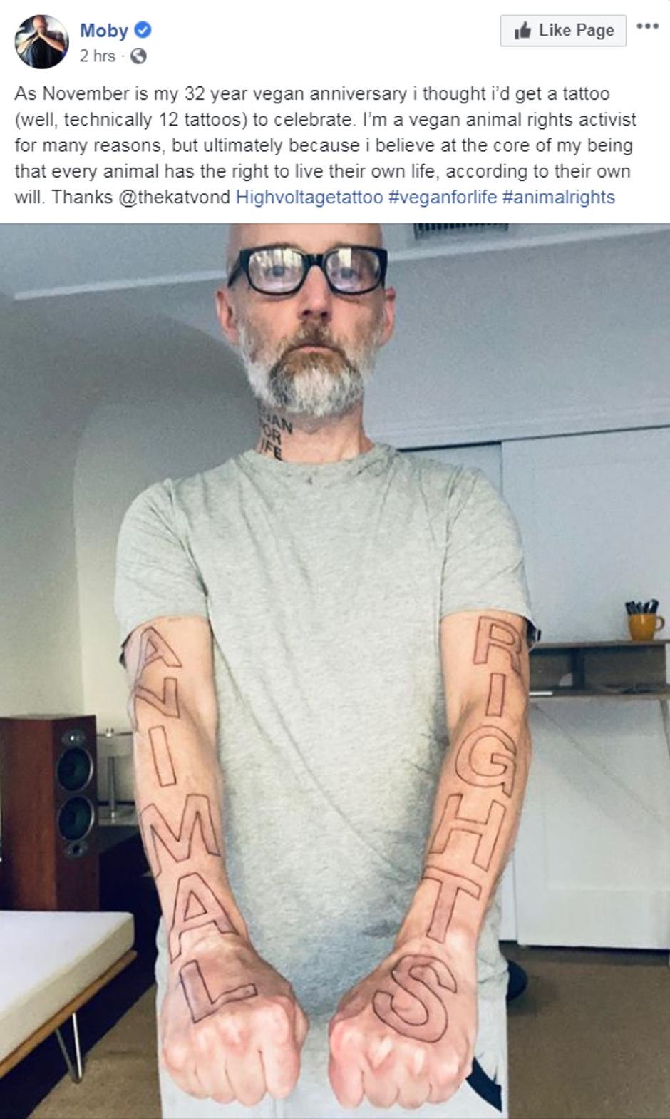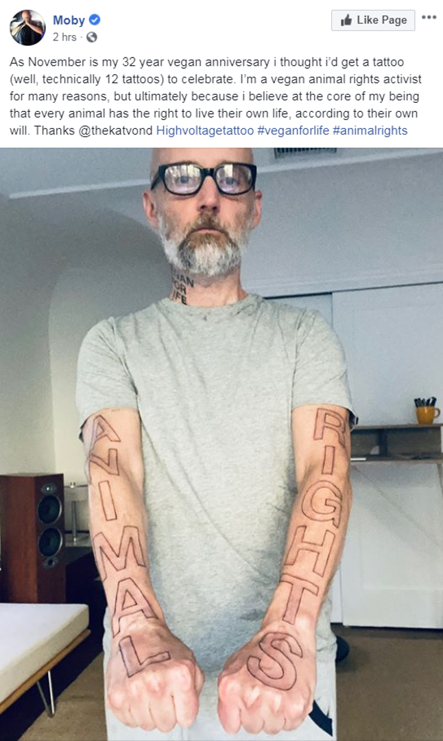 Naime, preko obje ruke je tetovorao slogan 'Animal rights'(prava životinja). Moby je vegan već 32 godine, a to ponosno dokazuje i tetovažom na vratu na kojoj piše 'vegan za cijeli život'.