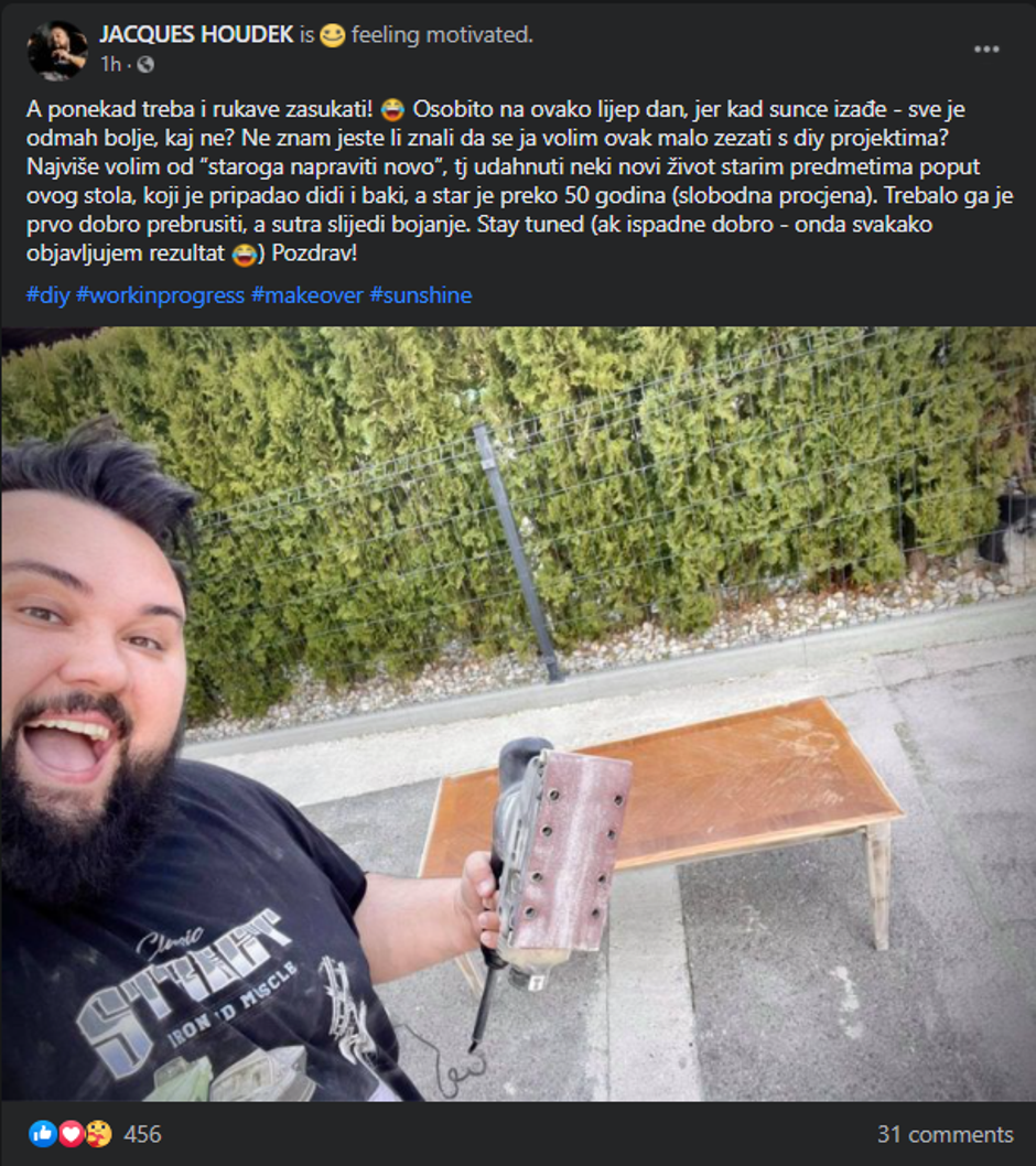 - A ponekad treba i rukave zasukati! Osobito na ovako lijep dan, jer kad sunce izađe - sve je odmah bolje, kaj ne? Ne znam jeste li znali da se ja volim ovak malo zezati s diy projektima? Najviše volim od “staroga napraviti novo”, tj udahnuti neki novi život starim predmetima poput ovog stola, koji je pripadao didi i baki, a star je preko 50 godina (slobodna procjena). Trebalo ga je prvo dobro prebrusiti, a sutra slijedi bojanje. Stay tuned (ak ispadne dobro - onda svakako objavljujem rezultat ) Pozdrav! - kazao je Jacques u objavi koja je prikupila gotovo 500 lajkova.