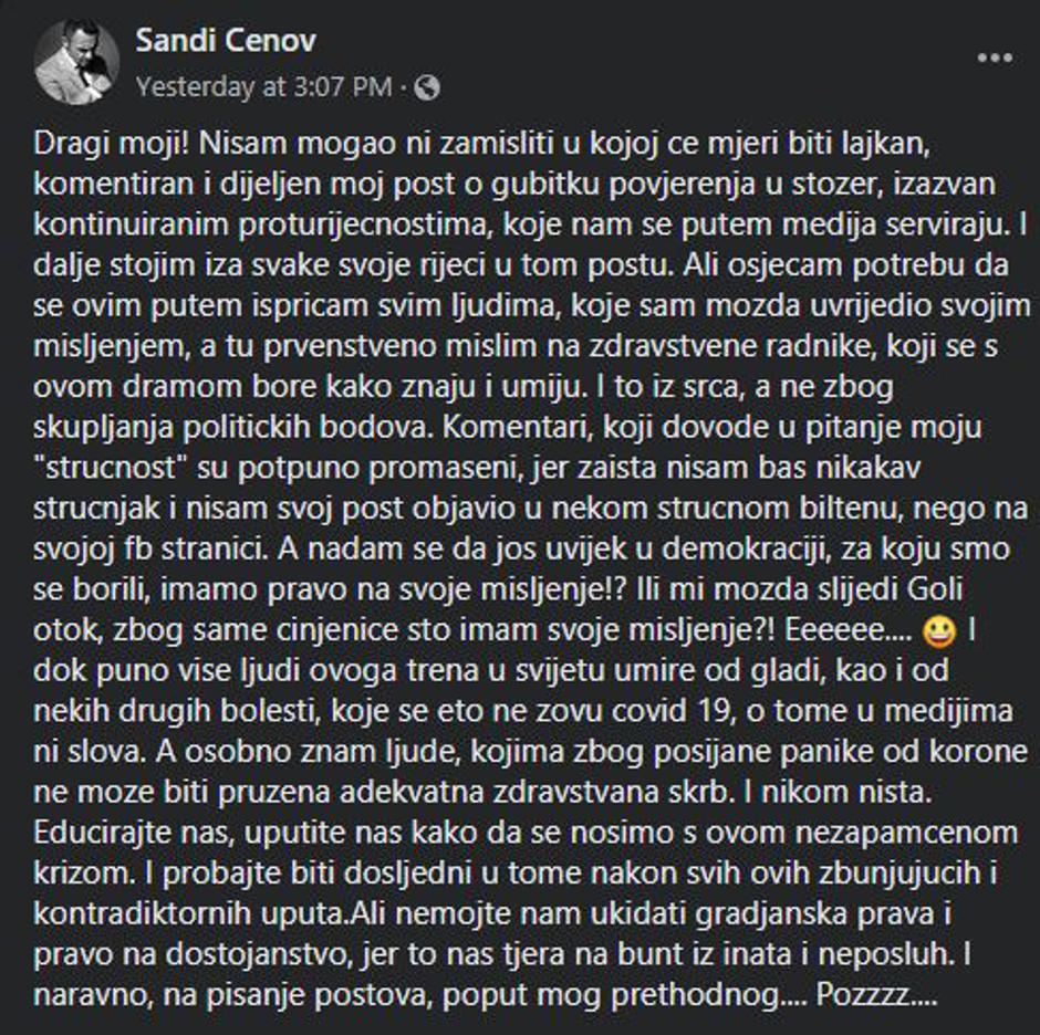 "I dalje stojim iza svake svoje rijeci iz te objave. Ali osjećam potrebu da se ovim putem ispričam svim ljudima, koje sam možda uvrijedio svojim mišljenjem, a tu prvenstveno mislim na zdravstvene radnike, koji se s ovom dramom bore kako znaju i umiju. I to iz srca, a ne zbog skupljanja političkih bodova. Komentari, koji dovode u pitanje moju 'stručnost' su potpuno promašeni, jer zaista nisam bas nikakav stručnjak i nisam svoj post objavio u nekom stručnom biltenu, nego na svojoj fb stranici. A nadam se da još uvijek u demokraciji, za koju smo se borili, imamo pravo na svoje mišljenje!? Ili mi možda slijedi Goli otok, zbog same činjenice sto imam svoje mišljenje?! I dok puno više ljudi ovoga trena u svijetu umire od gladi, kao i od nekih drugih bolesti, koje se eto ne zovu Covid 19, o tome u medijima ni slova", napisao je Cenov i nastavio: