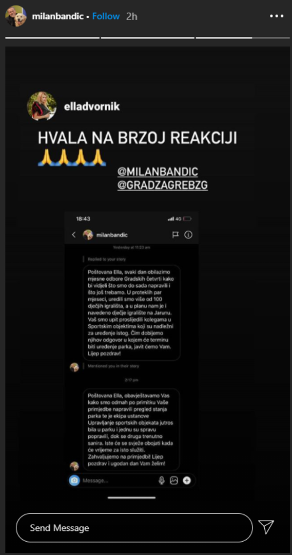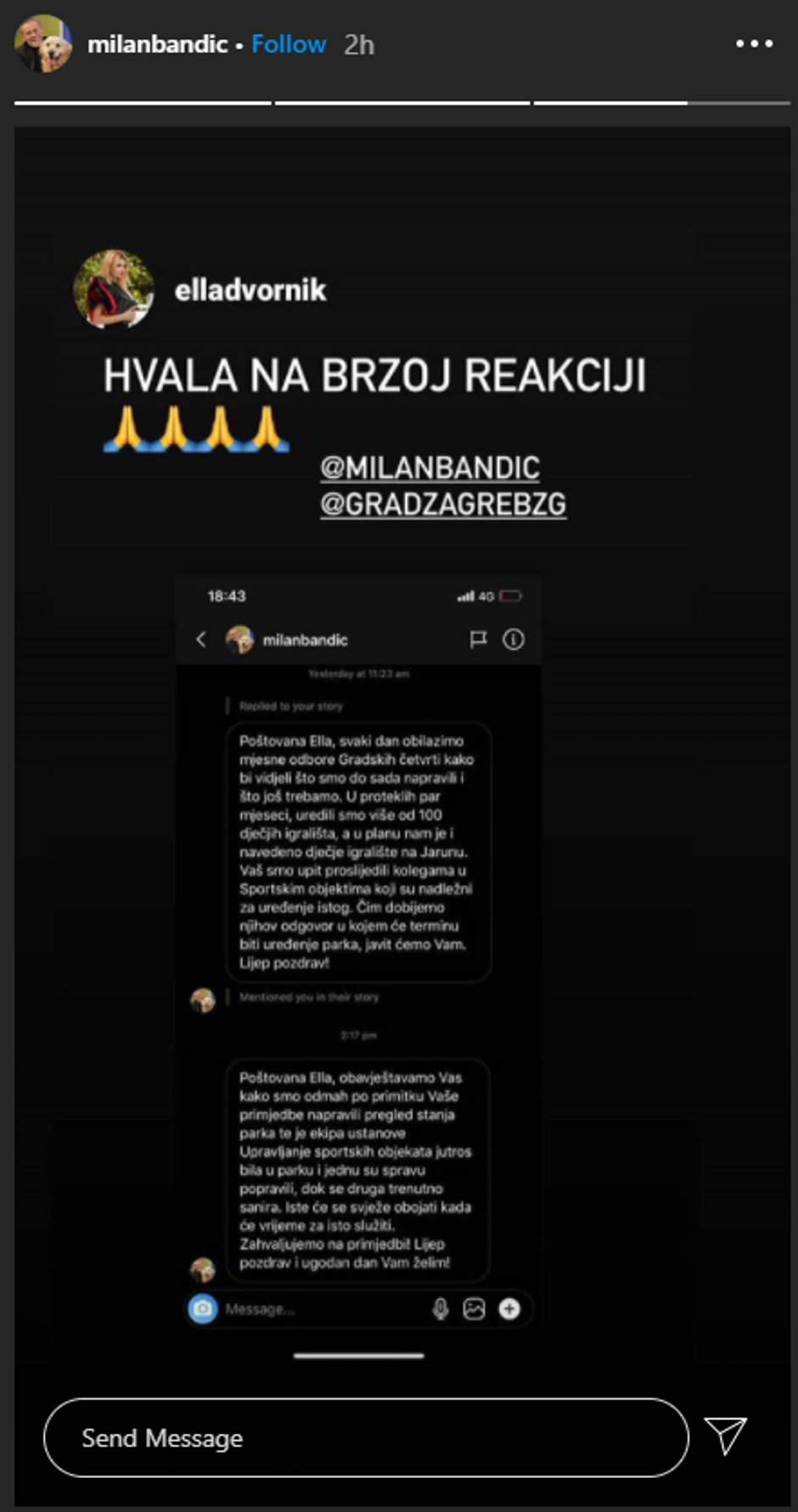 "Mole se Grad Zagreb i Milan Bandić da učine nešto po pitanju dječjeg igrališta na jezeru Jarun. Stvarno je došlo do stanja da se ne može koristiti i opasno je za djecu", napisala je Ella i priložila fotografije igrališta. Nedugo nakon toga stigao je odgovor kako će njezinu primjedbu proslijediti nadležnoj službi, a danas je u jutarnjim satima na svom Instagram profilu gradonačelnik podijelio njihov razgovor koji se odvio nakon što su službe izišle na teren.