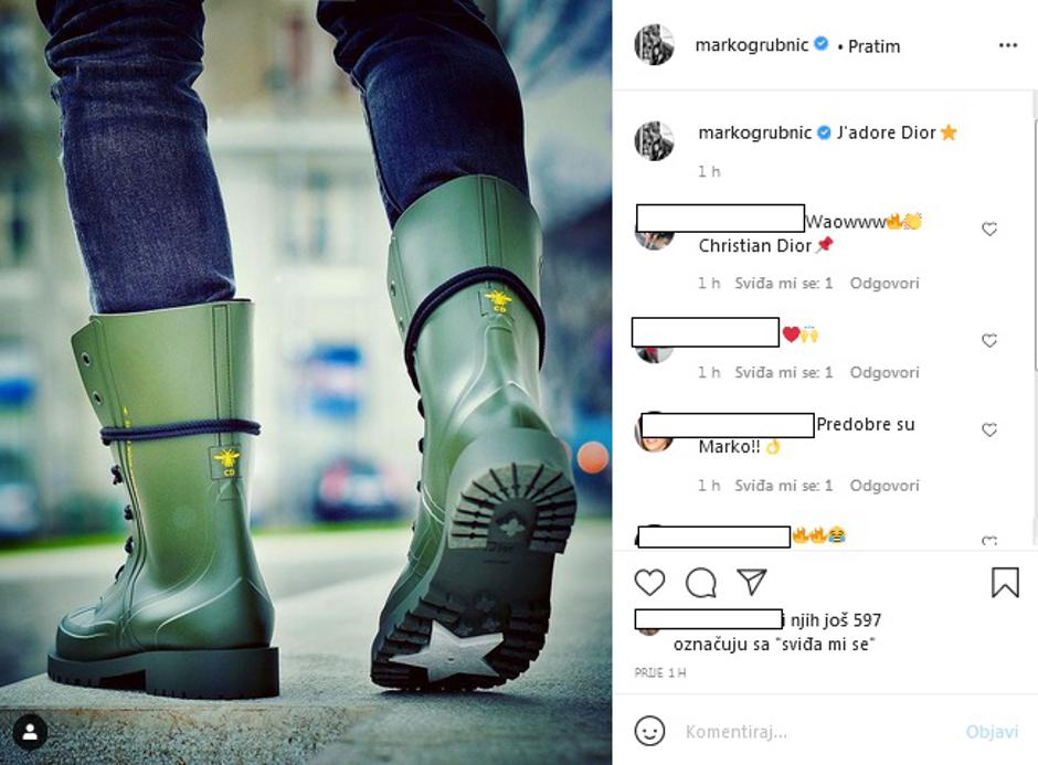 Marko Grubnić ponovno privlači pozornost svojim modnim izdanjima. Jutros se pratiteljima pohvalio da je spreman za kišu i to zahvaljujući gumenim čizmama brenda Dior. Iako je riječ o unisex modelu iz 2019. godine koji se više ne može naći na službenoj Dior stranici čizme su još uvijek dostupne na nekim drugim stranicama. Na jednoj od njih njihova cijena iznosi 1200 dolara ili otprilike 7500 kuna. Ovo je još jedan dokaz da Marko ne štedi kada je moda u pitanju.