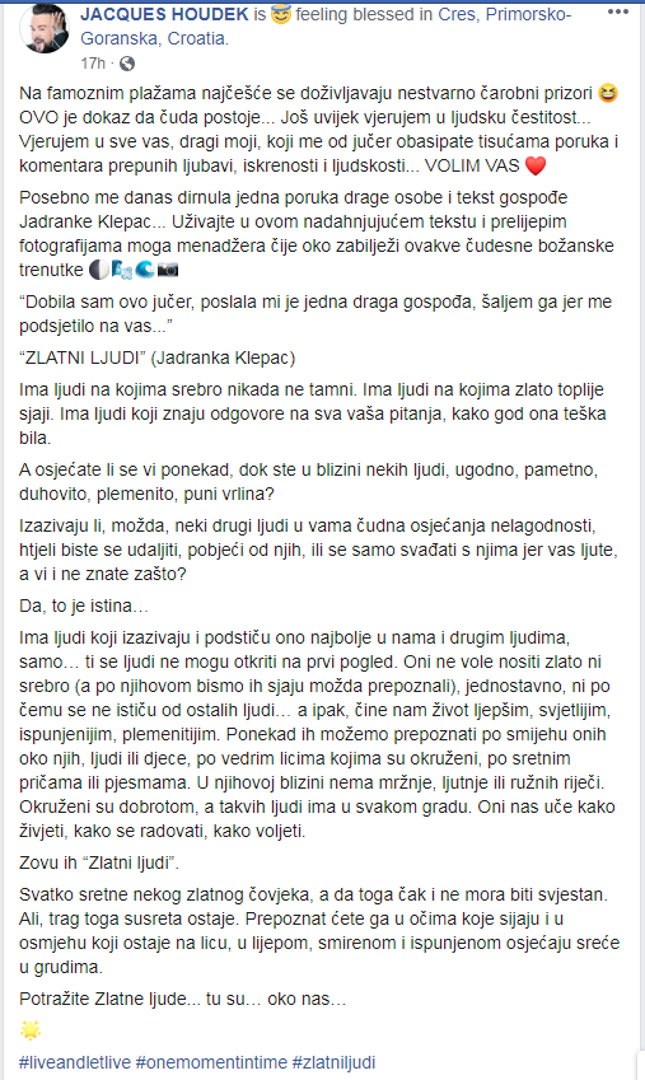 - Na famoznim plažama najčešće se doživljavaju nestvarno čarobni prizori. OVO je dokaz da čuda postoje... Još uvijek vjerujem u ljudsku čestitost... Vjerujem u sve vas, dragi moji, koji me od jučer obasipate tisućama poruka i komentara prepunih ljubavi, iskrenosti i ljudskosti... VOLIM VAS. Posebno me danas dirnula jedna poruka drage osobe i tekst gospođe Jadranke Klepac... Uživajte u ovom nadahnjujućem tekstu i prelijepim fotografijama mog menadžera čije oko zabilježi ovakve čudesne božanske trenutke - napisao je Jacques uz fotografije zalaska sunca na Cresu pa podijelio duži tekst o "Zlatnim ljudima".