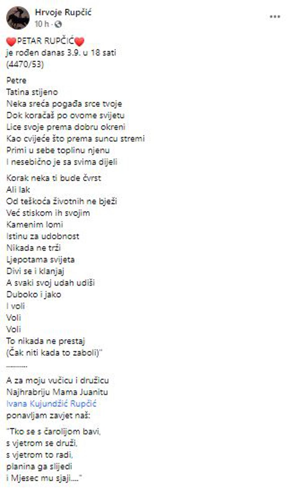 "PETAR RUPČIĆ je rođen danas 3. 9. u 18 sati", započeo je svoju emotivnu objavu Hrvoje i potom podijelio poruku posvećenu samo njemu.