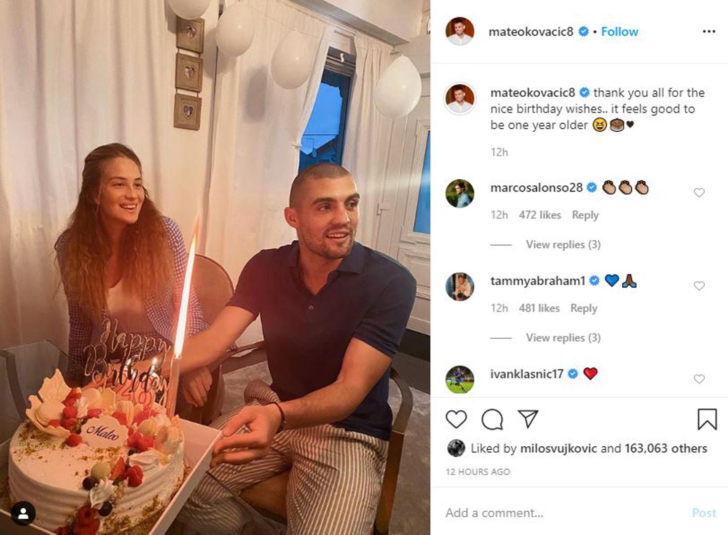 Najskuplji nogometaš Hrvatske Mateo Kovačić proslavio je svoj 26. rođendan uz suprugu Izabel, slatku tortu i brojnim čestitkama diljem svijeta. Skromni Mateo svima se zahvalio na Instagramu i objavio fotografiju na kojoj su supružnici nasmijani uz tortu okruženi balonima.