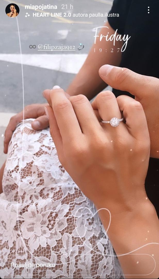 U videu Mia ne može sakriti koliko je sretna i istovremeno se smije i plače od sreće, a objavila je i fotografiju na kojoj se vidi kako je lijep prsten kojim ju je Filip zaprosio. Uz fotografiju zaručničkog prstena napisala je: Petak, 19.27 h, za pretpostaviti je kako se radi o vremenu kad je pala prosidba.