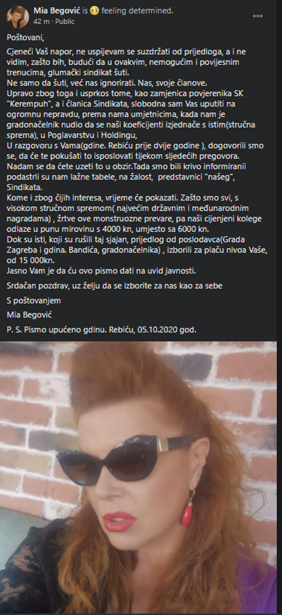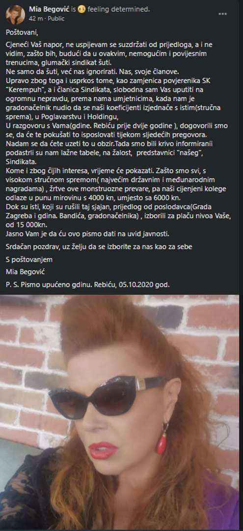 "Cijeneći Vaš napor, ne uspijevam se suzdržati od prijedloga, a i ne vidim zašto bih, budući da u ovakvim, nemogućim i povijesnim trenucima, glumački sindikat šuti. Ne samo da šuti, već nas ignorira. Nas, svoje članove. Upravo zbog toga i usprkos tome, kao zamjenica povjerenika SK 'Kerempuh', a i članica sindikata, slobodna sam Vas uputiti na ogromnu nepravdu, prema nama umjetnicima, kada nam je gradonačelnik nudio da se naši koeficijenti izjednače s istim (stručna sprema), u Poglavarstvu i Holdingu", upozorila je Begović, i dodala da se prije dvije godine u razgovoru sa sindikatom dogovorilo da će se to isposlovati tijekom idućih pregovora.