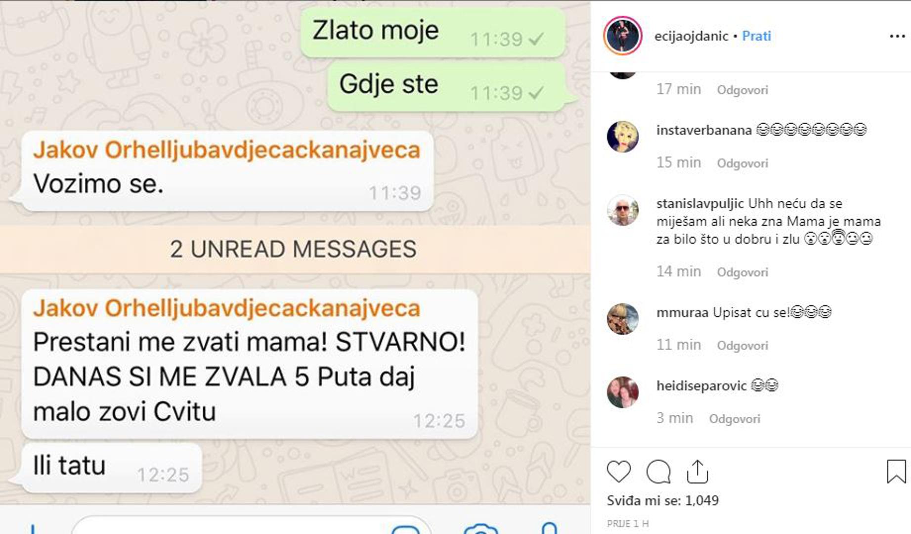 "Prestani me zvati mama! STVARNO! Danas si me zvala pet puta, daj malo zovi Cvitu. Ili tatu", predložio je Ecijin sin, Jakov, kojeg u mobitelu ima spremljenog pod imenom 'Jakov Orhelljubavdječačkanajveća'.